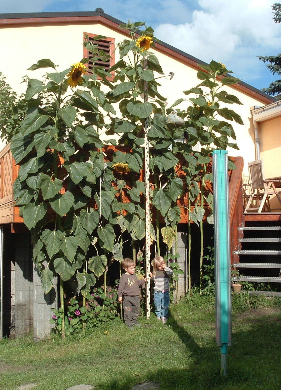 Hier mal meine Sonnenblume. Da eine Nahaufnahme allein aber dieses Jahr irgendwie dem ganzen nicht gerecht wird, habe ich gestern meine Sonnenblumen nochmal zusammen mit einer 4-Meter-Messlatte fotografiert. Die reichte aber nicht. Die höchste ist diesmal über 4,40 m. Das hatte ich noch nie Die kleinen sind übrigens meine zwei ca. 1 m großen Zwillinge (haben fein die Messlatte gehalten)