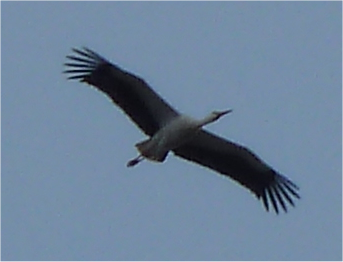Und vor ein paar Tagen hab ich den ersten Weißstorch hier in der Gegend gesehen. Die fliegen wohl alljährlich hier drüber, aber ich hab noch nie einen zu Gesicht gekriegt. Das Bild ist nicht berauschend, hatte in der Eile weder eine brauchbare Kamera noch ein Stativ zur Hand
