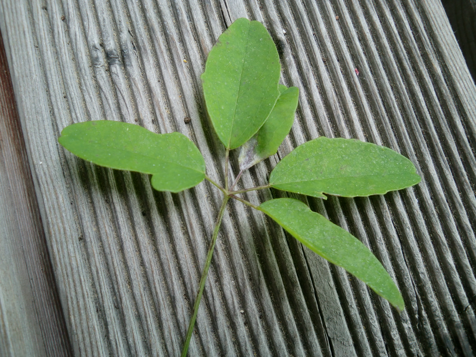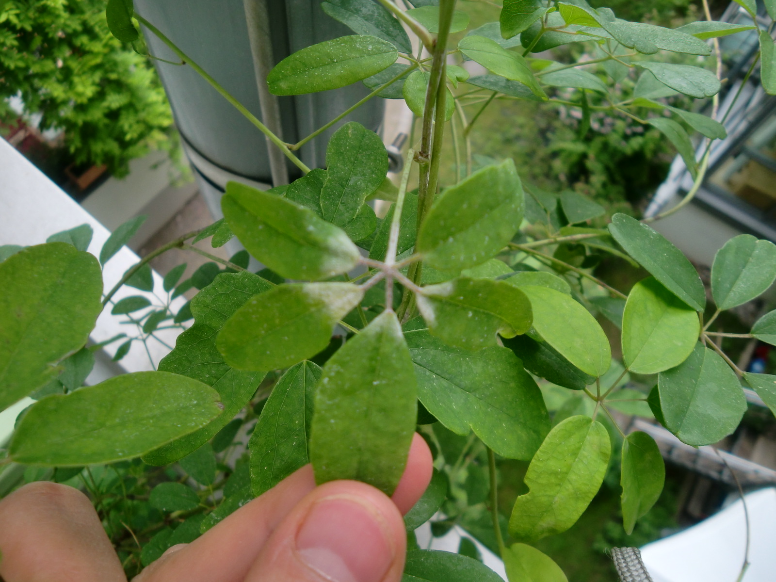 Dieser weißliche Belag ist auf der Blattober- und unterseite. Wenn man ganz genau hinschaut, gibt es auch noch so etwas wie ganz feine Spinnweben zwischen den einzelnen Blättchen der gefingerten Blätter. Das passt doch eher nicht zu Mehltau, oder?