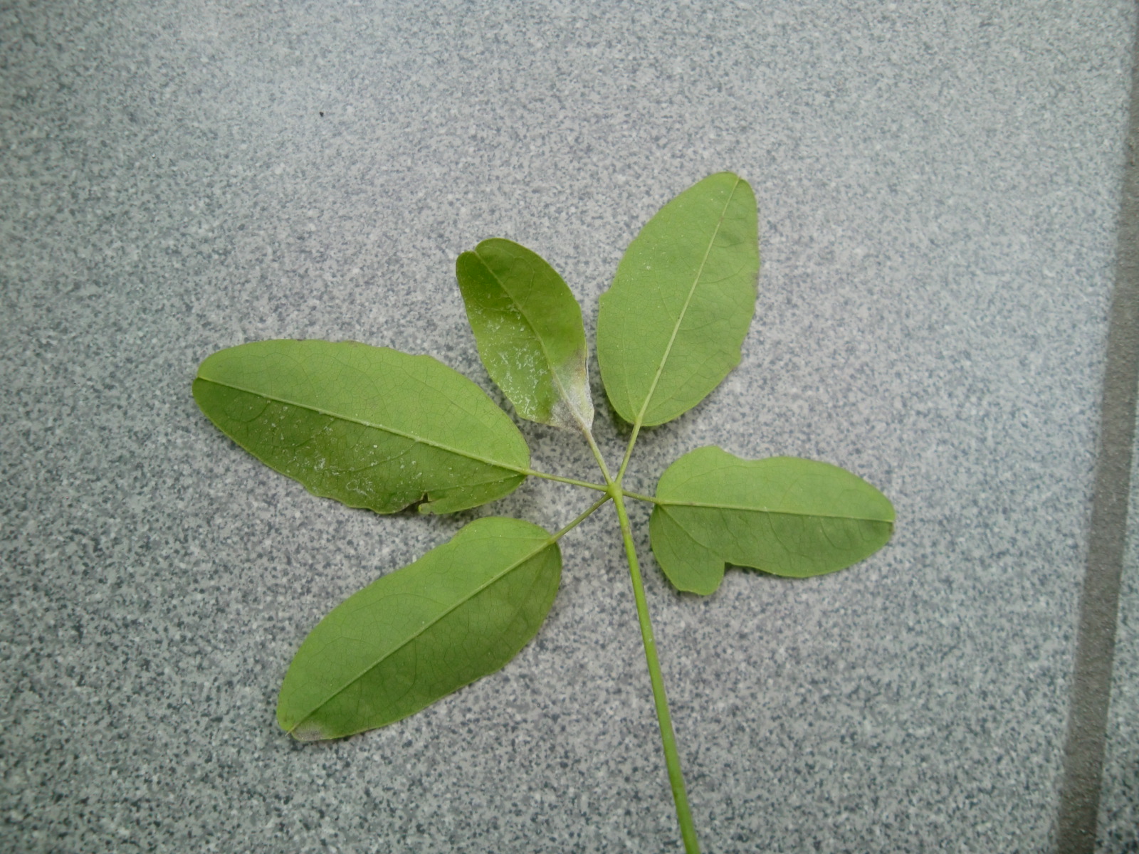Dieser weißliche Belag ist auf der Blattober- und unterseite. Wenn man ganz genau hinschaut, gibt es auch noch so etwas wie ganz feine Spinnweben zwischen den einzelnen Blättchen der gefingerten Blätter. Das passt doch eher nicht zu Mehltau, oder?