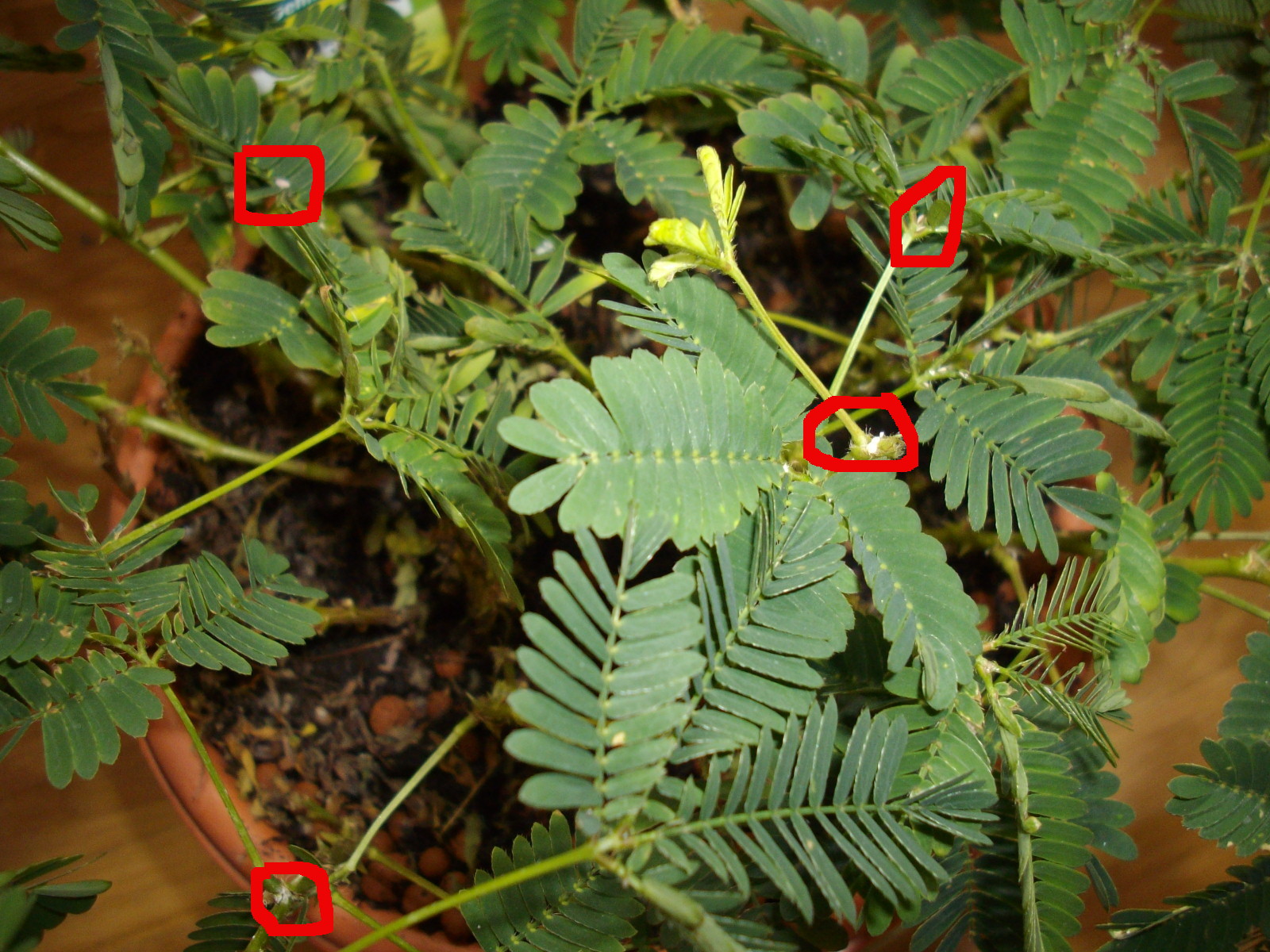 gute zwei Wochen nachdem ich mit im Dehner zwei Mimosen geholt habe, sind mit bei der Kontrolle kleine ungewollte Bewohner aufgefallen. Der Mimose tun sie nicht besonders gut. Und bevor ich jetzt einfach irgendwas mache, muss ich natürlich erst mal wissen, was es ist.