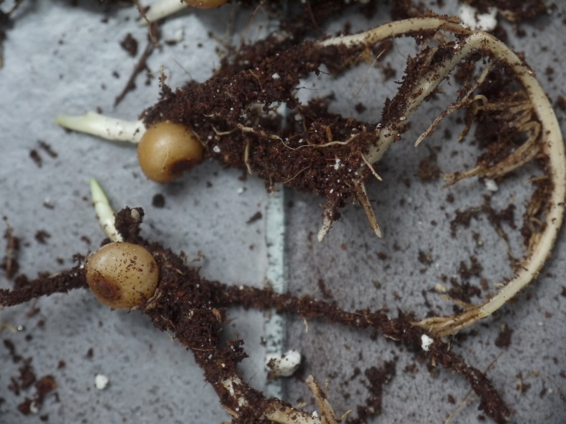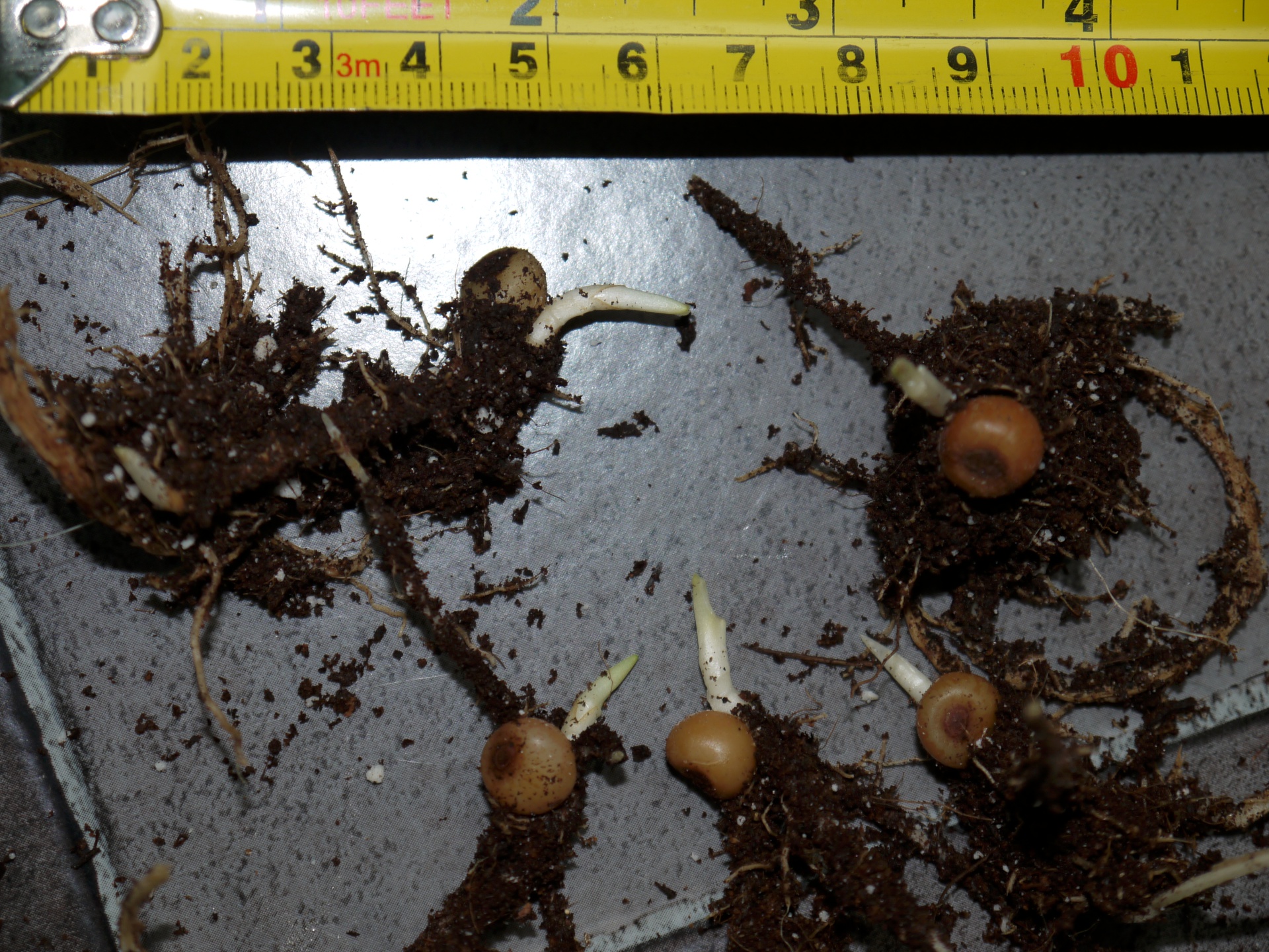 die dicken Wurzeln könnten schon ein Hinweis auf Araceae-Sämlinge sein. Typisch ist auch, daß sie sich manchmal ordentlich Zeit lassen. Bei einigen Arum kann es bis zur Keimung schon mal 3 Jahre dauern.