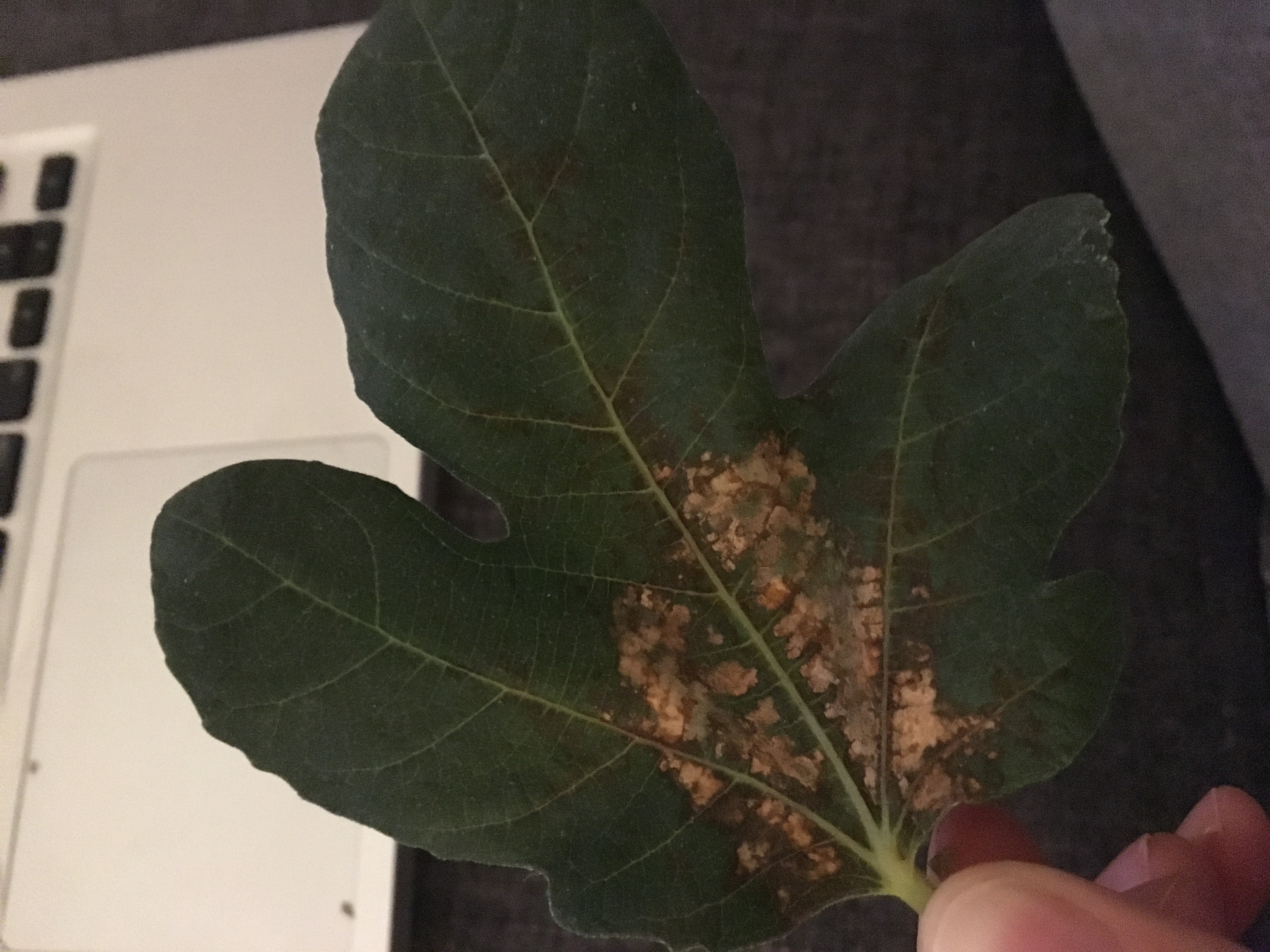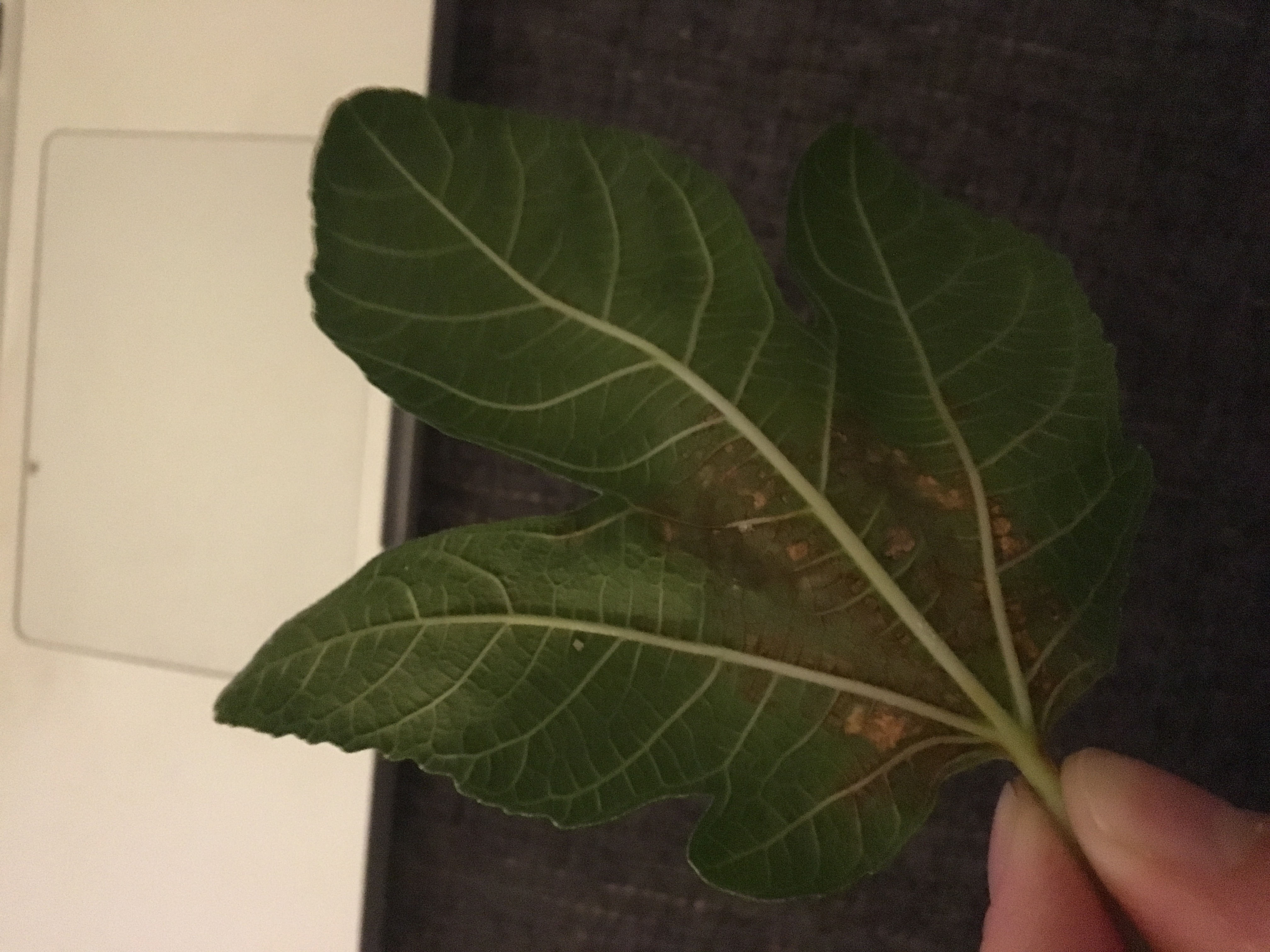 Der Ableger hat im Verlauf der letzten Monate zwei Blätter gebildet. Darauf haben sich zunächst sehr kleine rotbraune Flecken gebildet. Die Flecken sind nun größer und zum Teil auch irgendwie hell an einigen Stellen geworden (s. Bild). Die Feige steht ebenfalls am Südfenster in einem Gemisch aus Blumenerde und Sand.