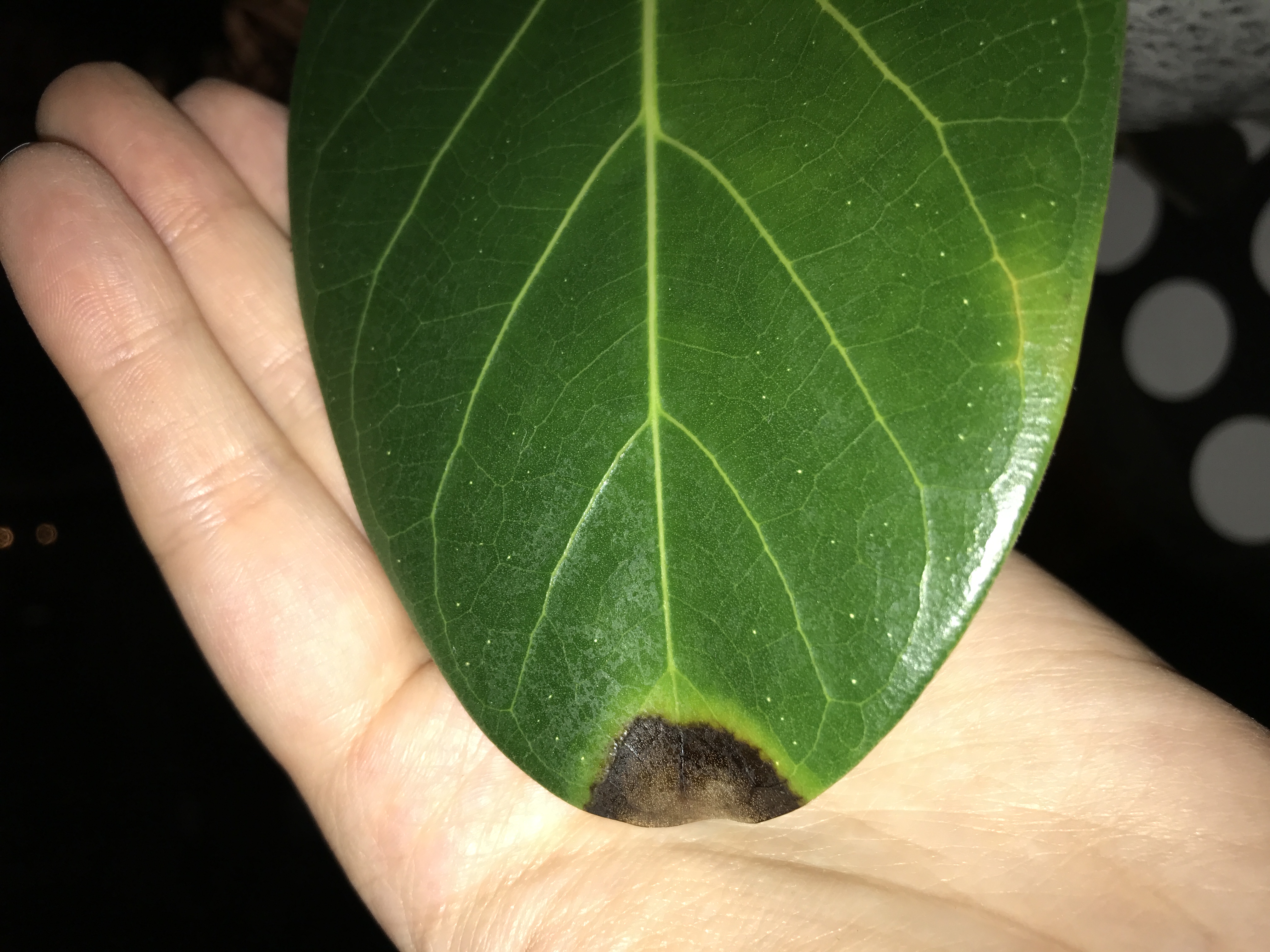 Nun hat er seit ein paar Wochen an zwei Blättern sehr dunkle Blattsitzen bekommen.