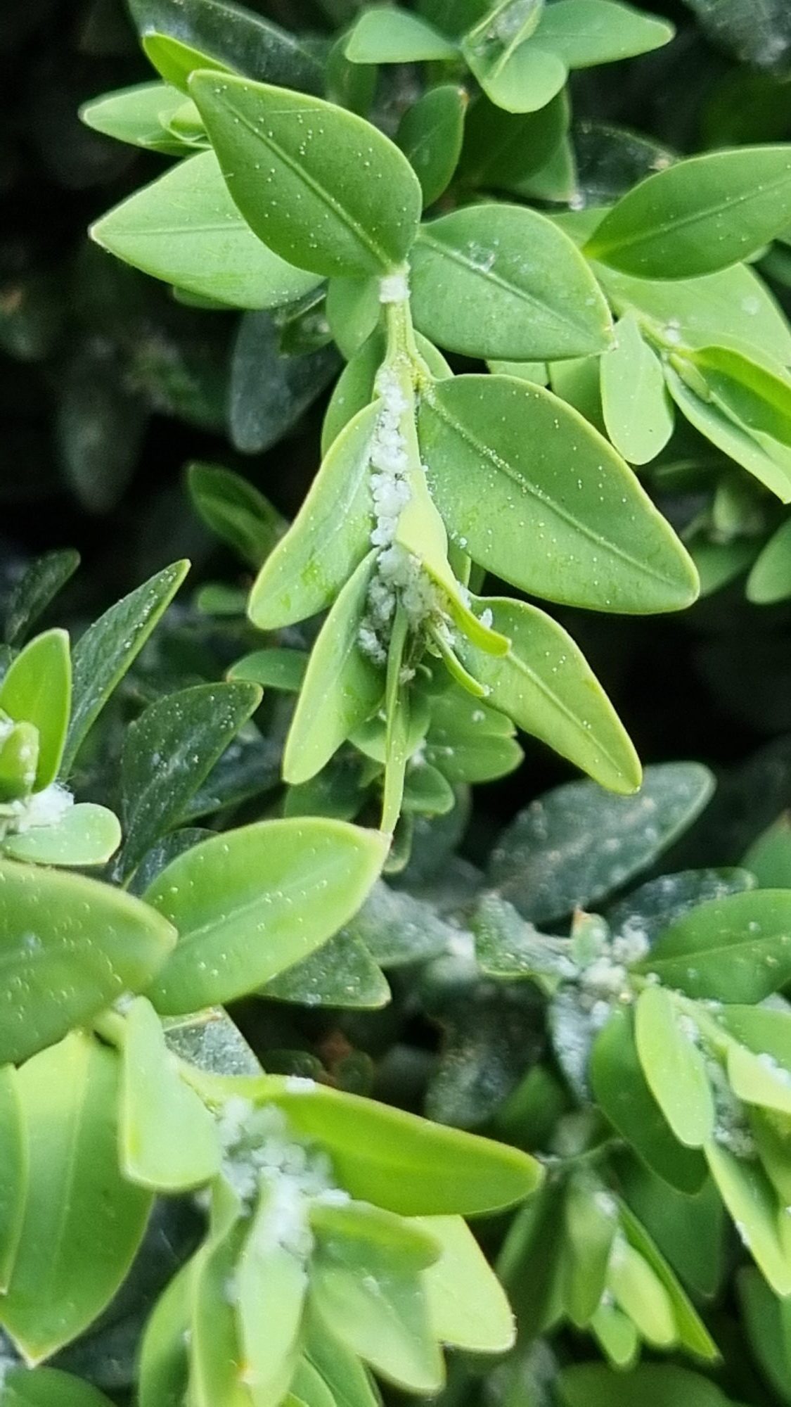 Kann mir jemand sagen, was mein Buchs hat? Sieht aus wie kleine Wattebällchen.