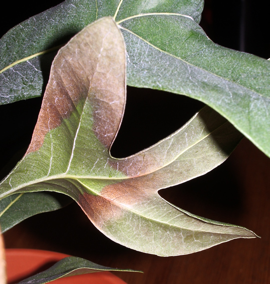 Die Blätter werden erst ab einer gewissen Querlinie ledrig und die Blattadern treten hervor und dann werden sie schließlich braun und trocken.