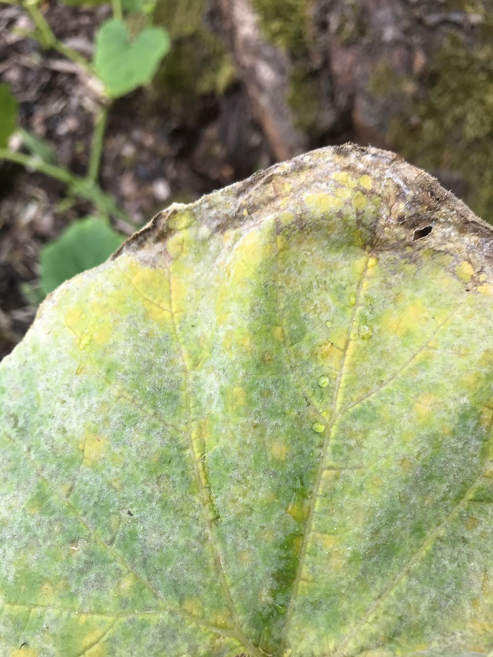 Wäre schon interessant zu wissen, ob vielleicht nur das älteste Blatt befallen ist (und ob dieses beschattet und dauerhaft auf feuchtem Boden liegt), ob alle Blätter der Pflanze so klein sind wie auf dem Foto... und ob also überhaupt Handlungsbedarf besteht und wenn ja, in welcher Richtung (nur Entfernen des Blattes, Düngung, trockenere Unterlage/Rankmöglichkeit...).