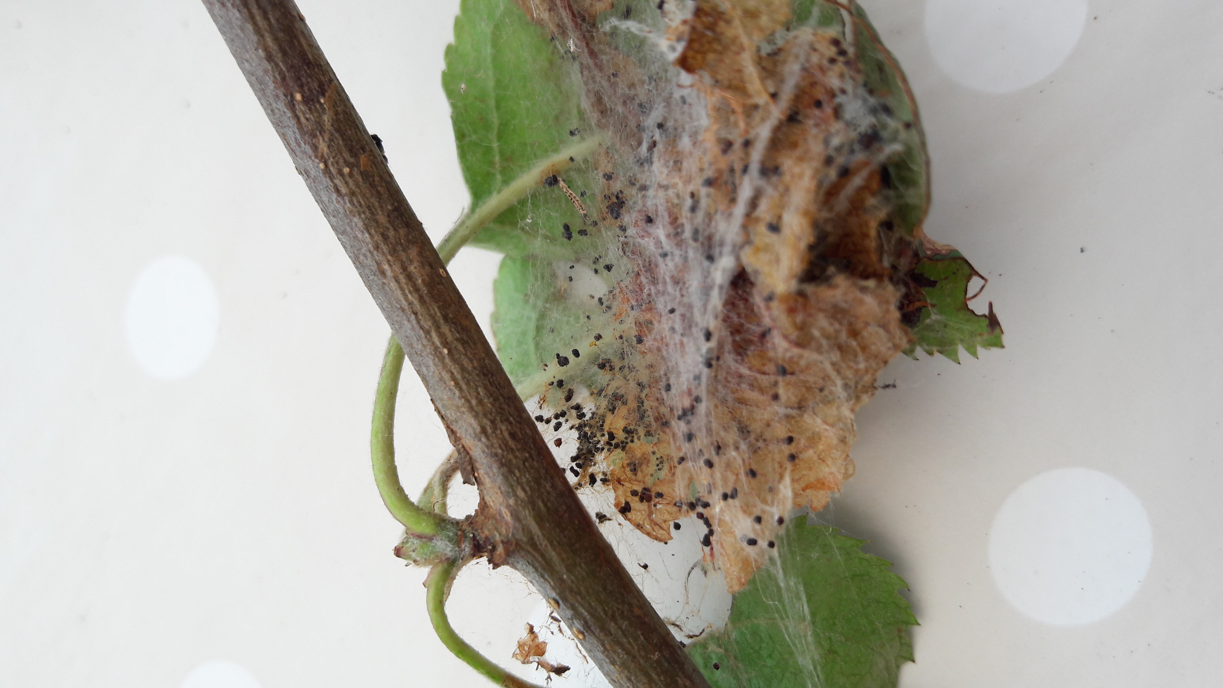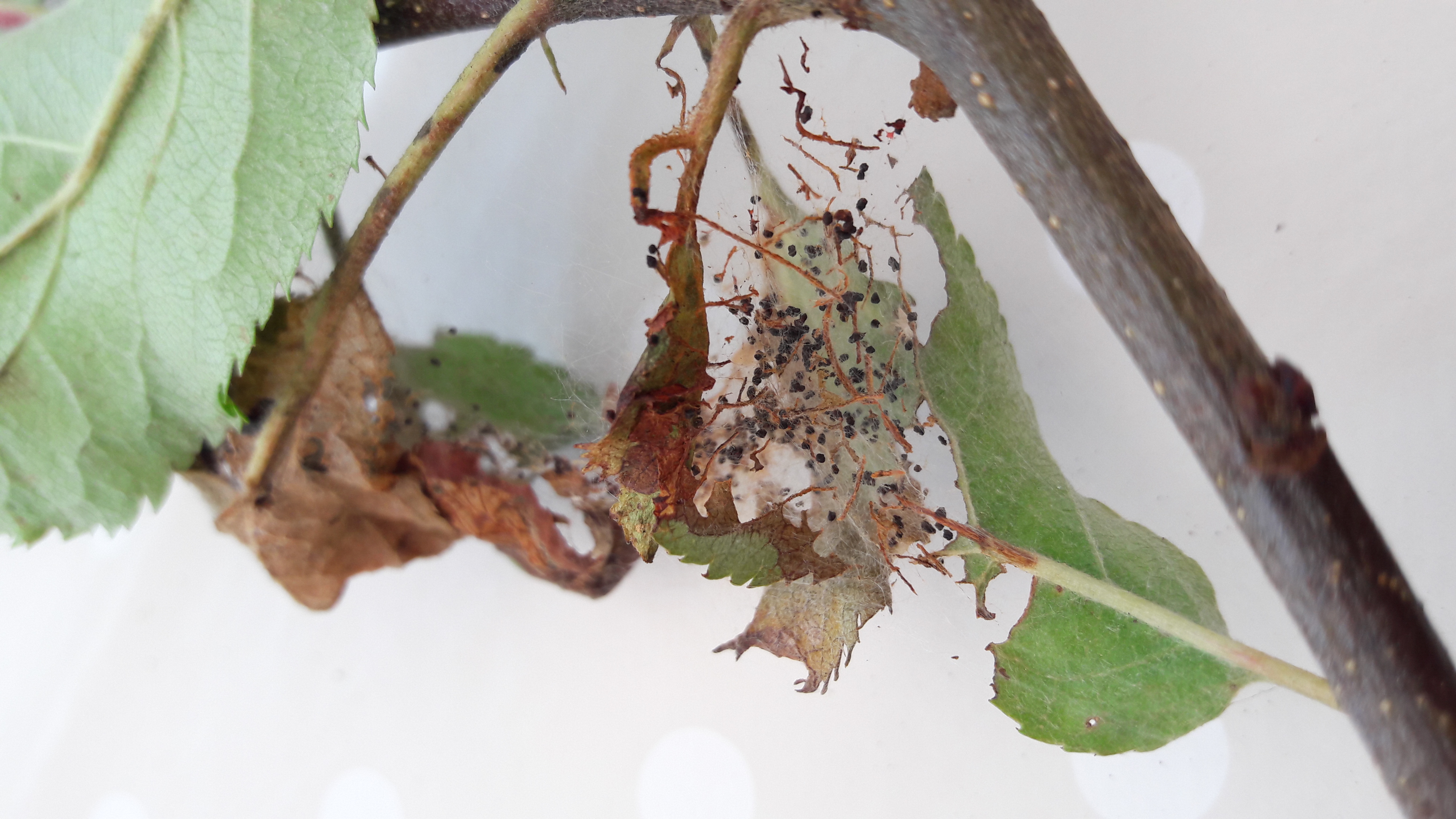 Das ist die Apfelbaumgespinstmotte, die aber meines Wissens nichts mit den Würmern in den Äpfeln zu tun hat.