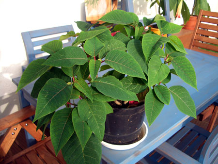 Ich möchte mal meinen Weihnachtsstern aus der letzten Adventszeit zeigen. Nach der Blüte verlor er fast alle Blätter bis er nur noch ein bemitleidenswertes Gerippe war. Aber schließlich trieb er wieder aus und jetzt ist er so ein wunderschön wuchernder Busch