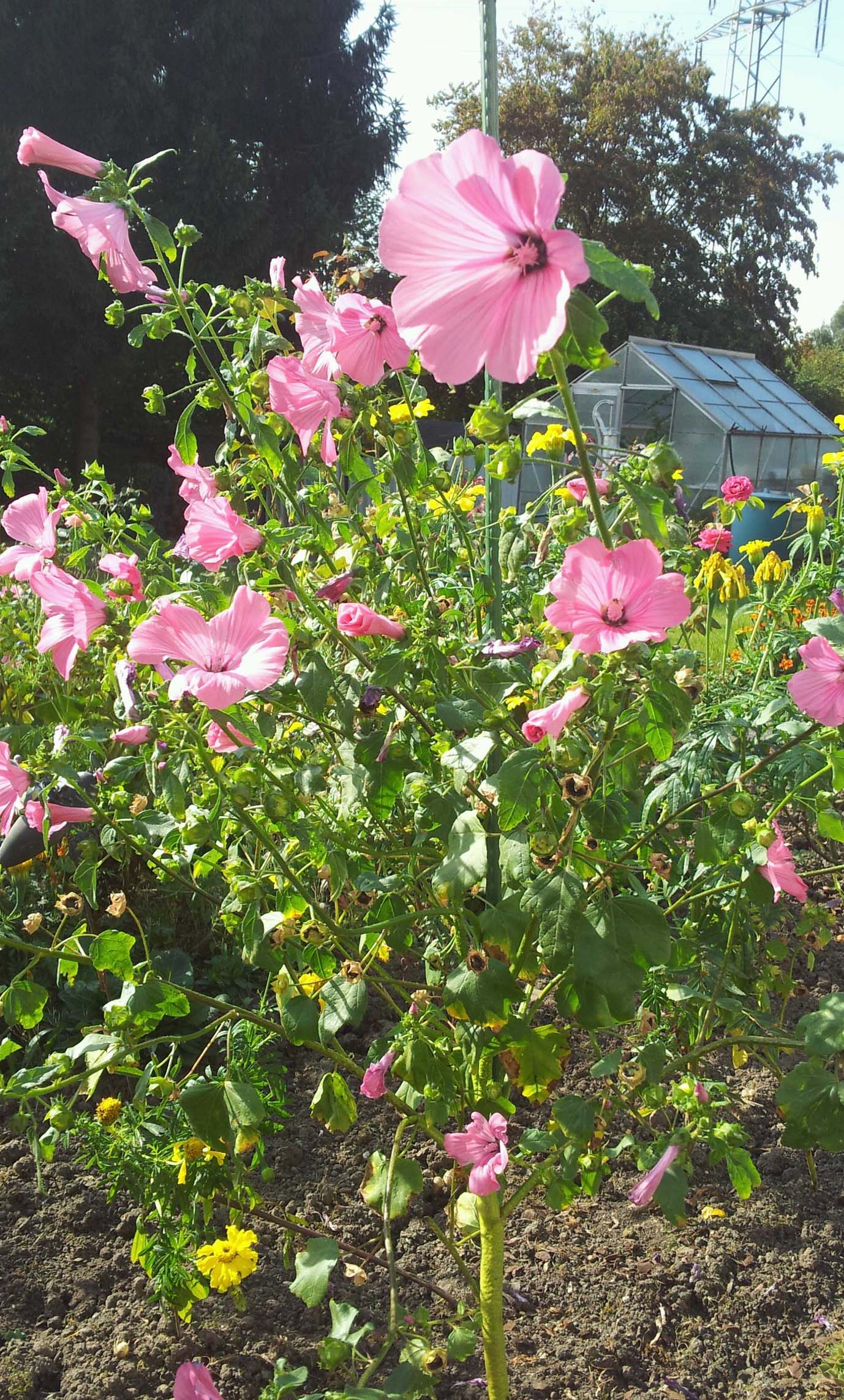 Ich dachte bei den Blüten erst an eine Malve, aber die Blätter sehen anders aus.