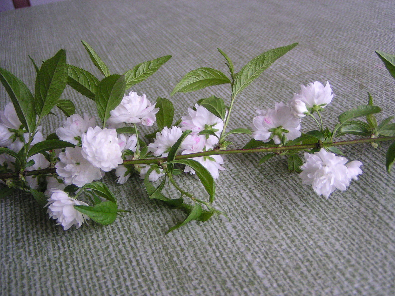 Irgendwas in Richtung Prunus serrulata, wobei mich ein wenig das rot-grüne Holz verwirrt, das kenne ich eher von Prunus persica (Pfirsich) , aber auf keinen Fall Philadelphus oder ähnliches..