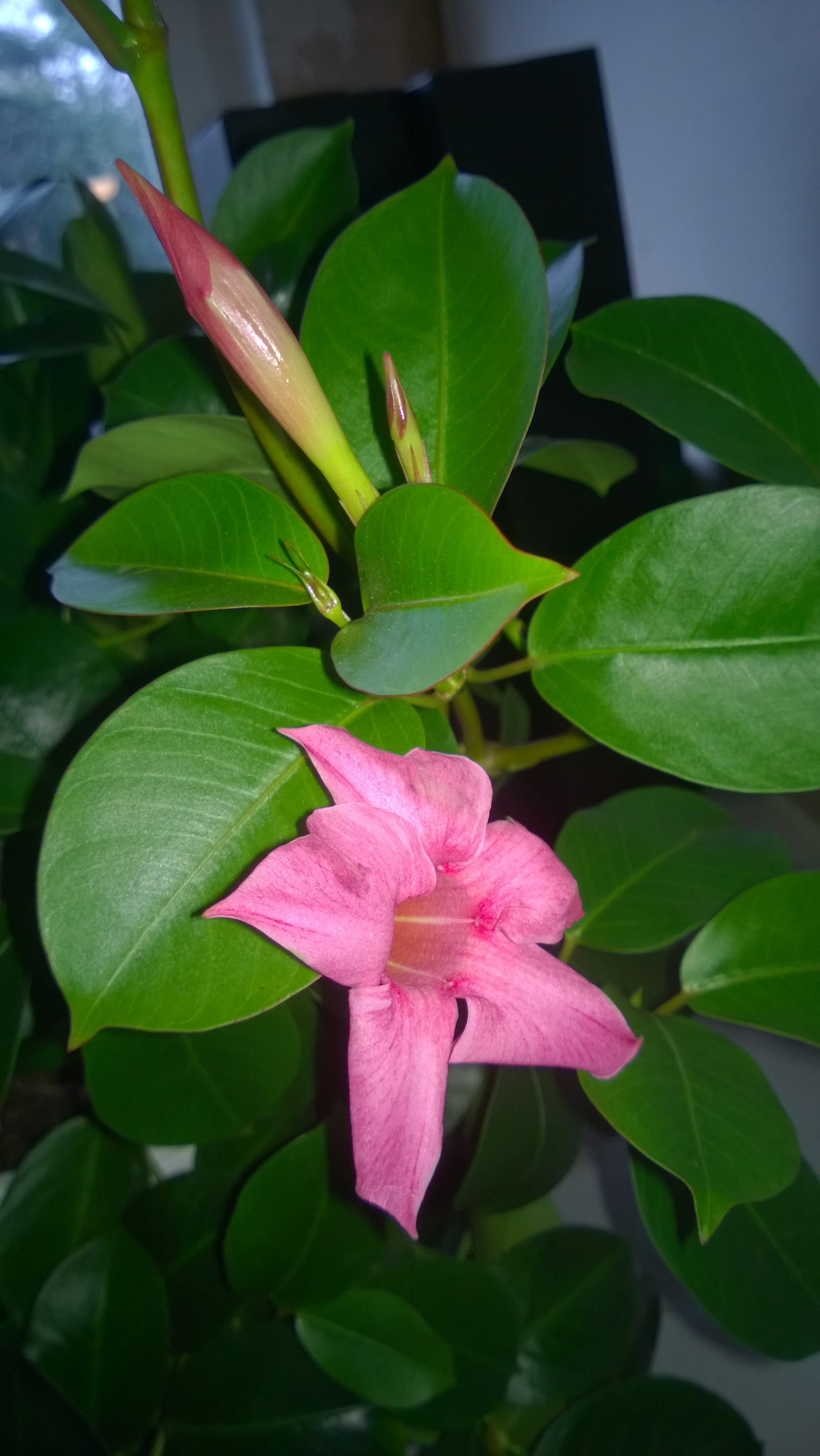 Es handelt sich um eine Ampelpflanze mit rosa, kelchförmigen Blüten (5 Blütenblätter, unten verwachsen). Die Blätter sind oben dunkelgrün, unten heller, ziemlich dünn und sehr fest. Vorne laufen sie spitz zu, ansonsten sind sie rund und ungezahnt.