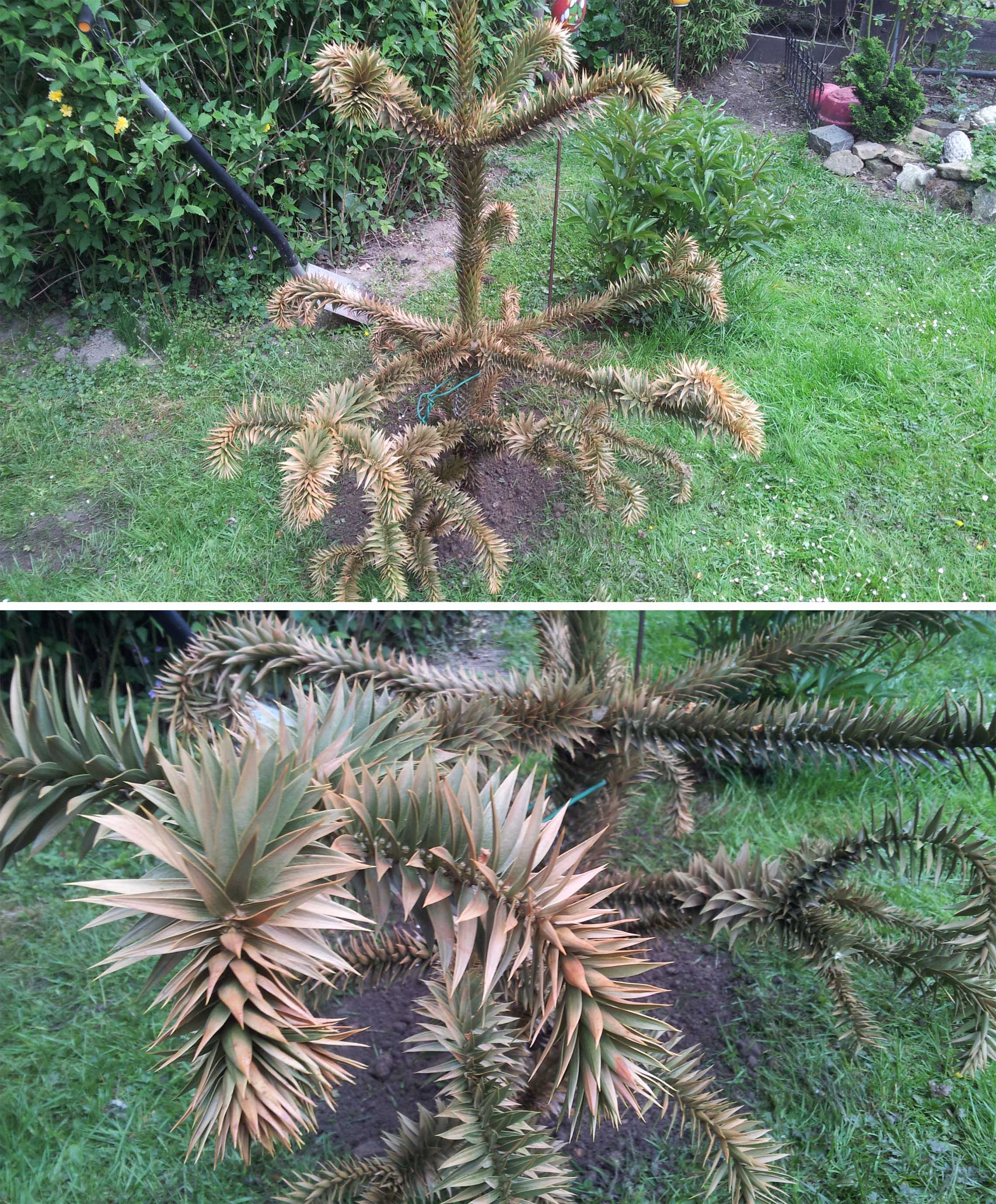Diese Araukarie ist ca. 5 Jahre alt und fängt in diesem Jahr an zu schwächeln (wird gelb).