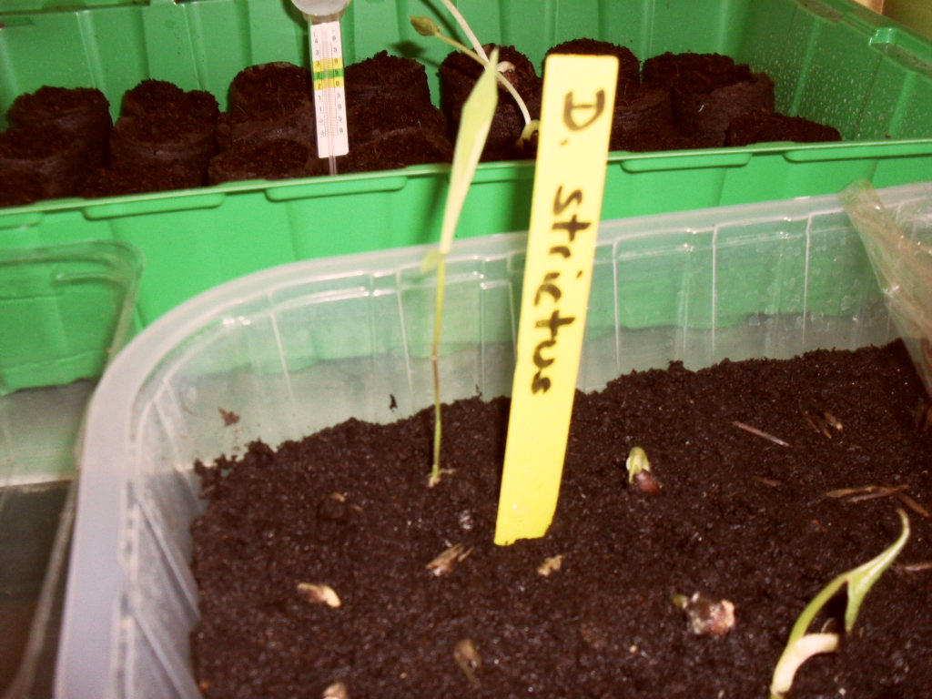 Ich hatte die versehentlich angesäbelten Cripps Pink Samen versehentlich auch noch kopfüber eingetopft. Hatte mich schon seit ein paar Tagen gewundert, daß bei einem etwas blattähnliches leicht aus der Erde schaut, aber nie was auftaucht und alle nur so nen grünen Stil mit brauner Spitze in die Höhe recken. Hab sie jetzt mal rausgezogen und mit den Keimblättern nach oben wieder in die Erde gesteckt.