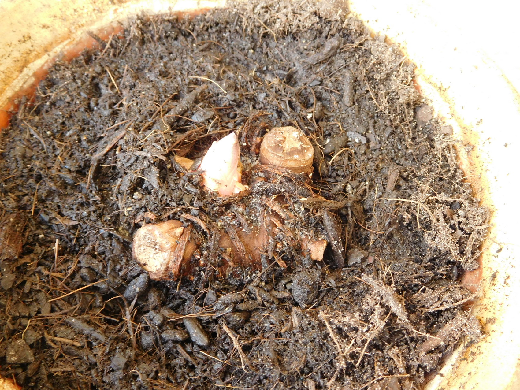 hier wächst amophophallus konjak, leider etwas spät aus dem keller hervorgeholt, weil vergessen. den austireb hat erim keller gemacht, ganz allein, ohne wasser und ohne licht. ich bin recht guter dinge, daß er noch kommt. ich denke, es wird dieses jahr wieder nur ein blatt.