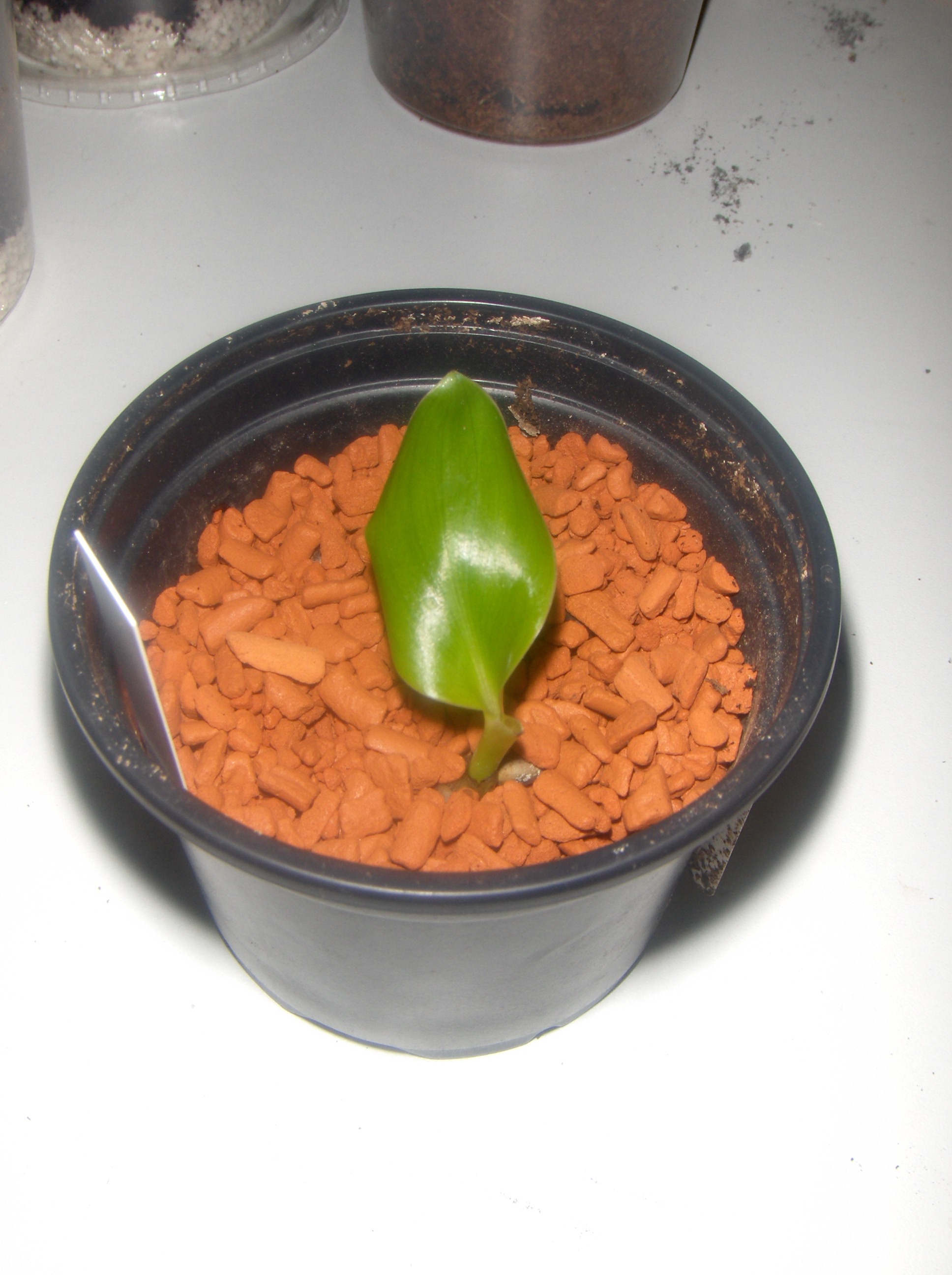 Meine Baby-Strelitzie hat endlich ihr erstes Blatt aufgerollt
