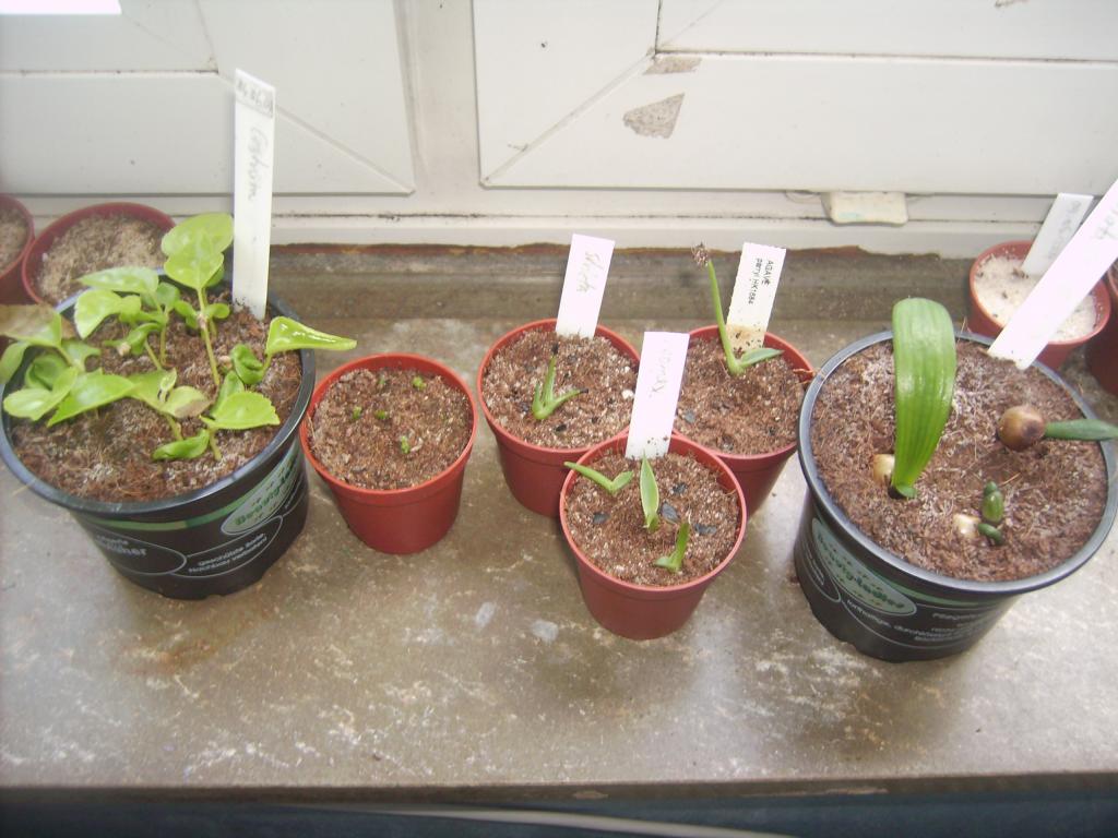Meine Kinderstube ist momentan recht übersichtlich. Sie sind auch schon etwas größer. Von links nach rechts: Hammerstrauch oder Aralie (ich weis nicht mehr welche was waren, bei dem Steckschild bin ich mir nicht mehr sicher, weis jemand von euch wie Hammerstrauch bzw. Aralien-Keimlinge aussehen ), Osterkaktus, Nachsaaten von Agave stricta, neomexicana und parryi (endlich auch mal die A. parryi, ist der einzige Keimling) und Clivien.