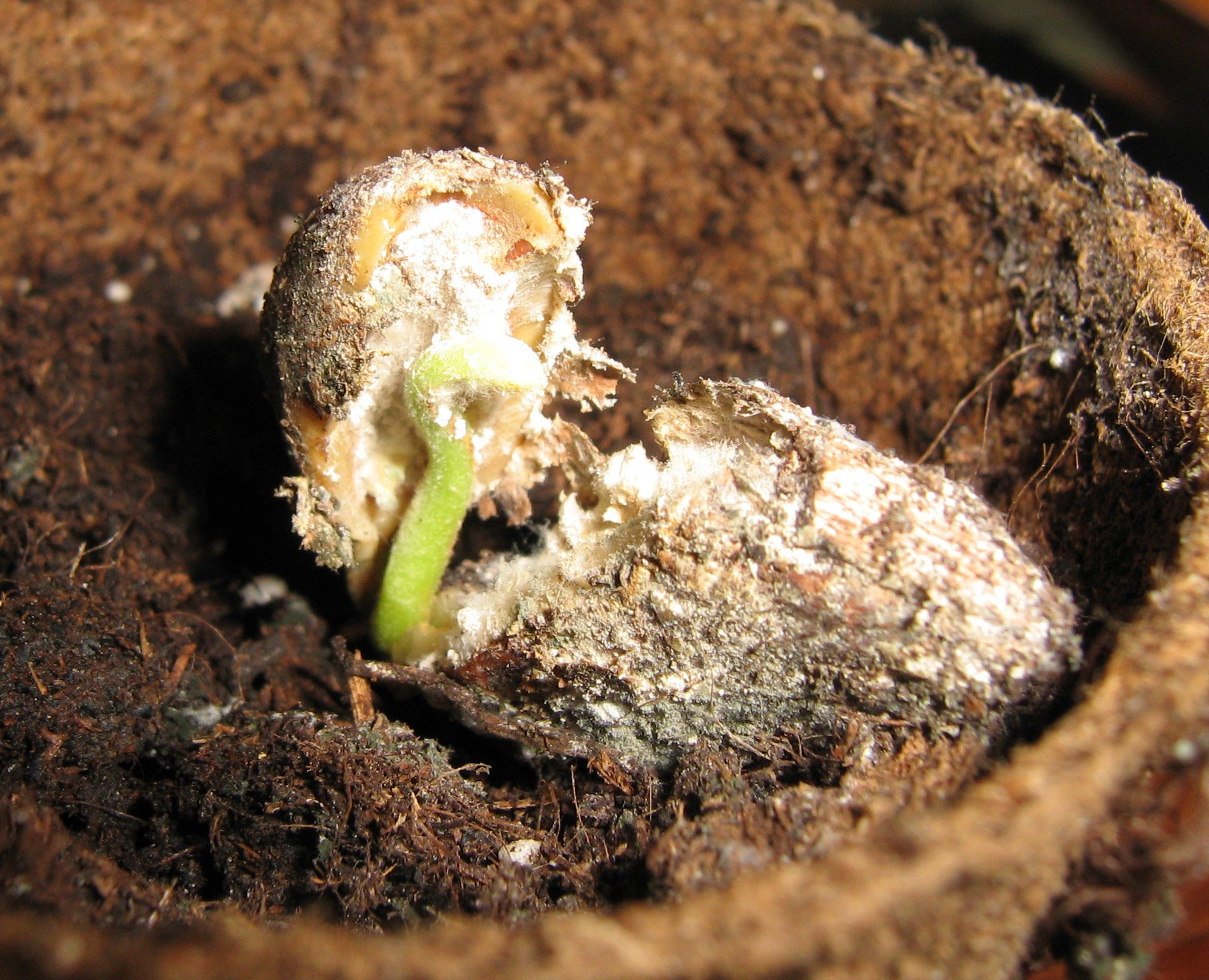 Heute ist einer meiner 2 Erdnusssamen gekeimt. Erstmal die Vorgeschichte: 2008 bekam ich aus dem Forum Erdnüsse. Die wurden angepflanzt, aufgrund von Vergesslichkeit udn Pflegefehlern sind allerdings nur 2 Erdnüsse mit je 1 Samen herausgekommen. Und nun kommt einer der beiden raus. Gesät wurden sie am 15.2.09. Da wir dieses Jahr vorhaben, ein kleines Gewächshaus zu bauen, werden sie diesmal wohl mehr Früchte tragen