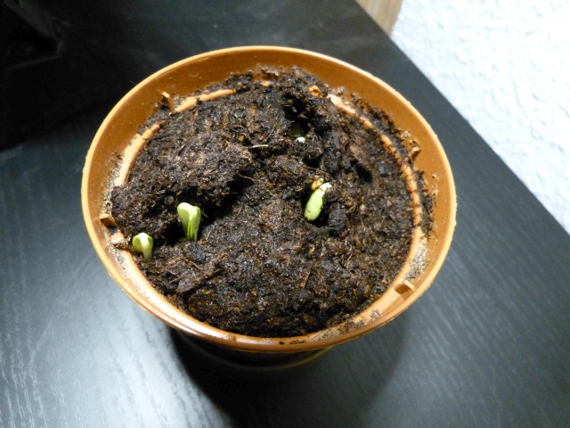 Ich habe ein paar Kumquats gegessen und die Kerne aus Langeweile in einen kleinen Topf gesteckt. Allerdings lagen da noch andere Kerne herum die ich auch irgendwie hinzugegeben habe. Heute hebt sich die oberste Erdschicht und ein paar Pflänzchen erblicken das Tageslicht. Nach Zitrusfrucht-Keimlingen sehen sie mir aber irgendwie nicht so richtig aus. Mals sehen was ich da mal wieder zum Leben erweckt habe
