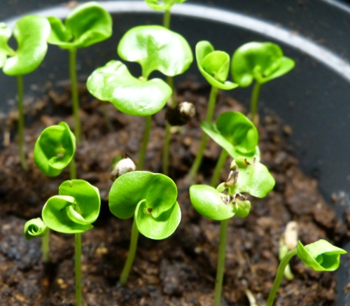 Ich habe ein paar Kumquats gegessen und die Kerne aus Langeweile in einen kleinen Topf gesteckt. Allerdings lagen da noch andere Kerne herum die ich auch irgendwie hinzugegeben habe. Heute hebt sich die oberste Erdschicht und ein paar Pflänzchen erblicken das Tageslicht. Nach Zitrusfrucht-Keimlingen sehen sie mir aber irgendwie nicht so richtig aus. Mals sehen was ich da mal wieder zum Leben erweckt habe