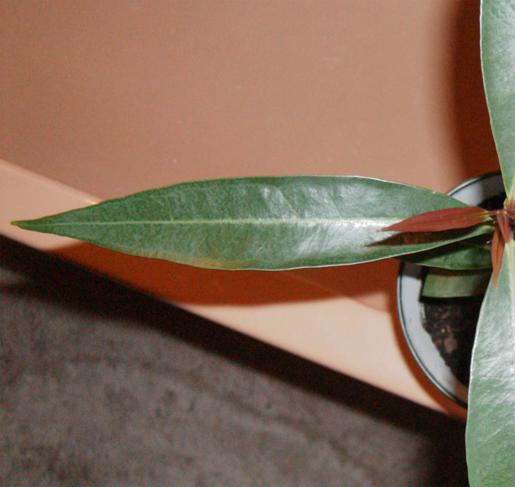 Hat vielleicht mal jemand ein Olivenblatt zur Hand und kann das gegens Licht halten? Die Fotos im Internet sind da nicht so eindeutig, aber ich denke der Olea europaea subsp africana kommt dem ziemlich nah. Müsste man nur noch wissen, was mit dem roten Austrieb ist bzw. ob der später verschwindet