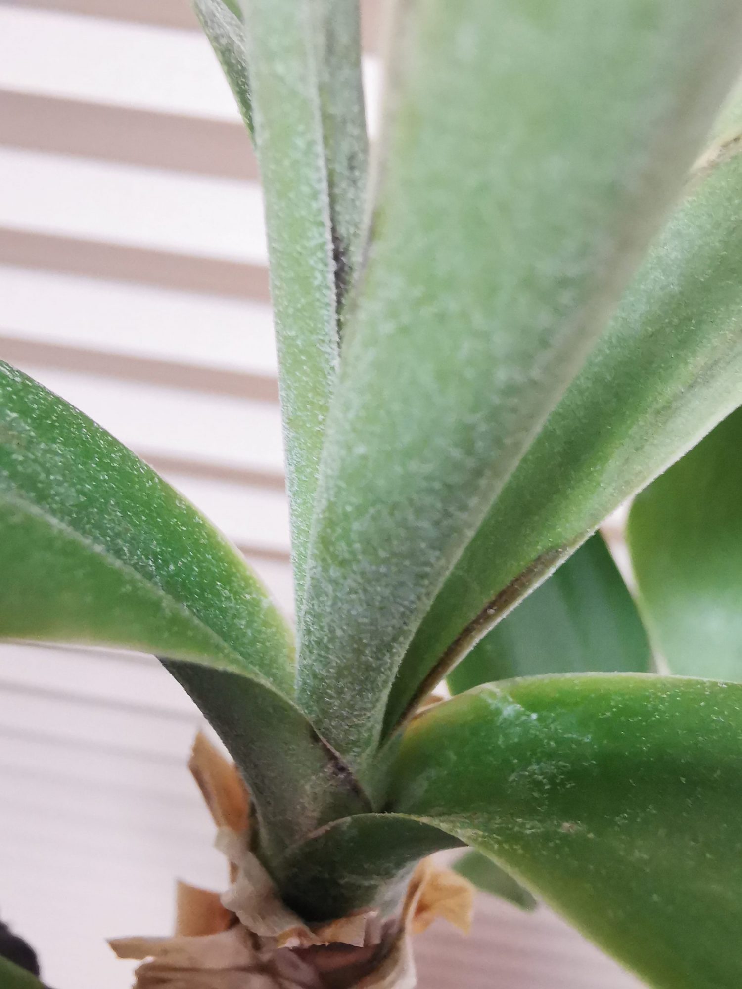 Die größere hatte das Problem auch, allerdings weniger Staub, bis fast gar keinen mehr, nur noch die Blättränder.