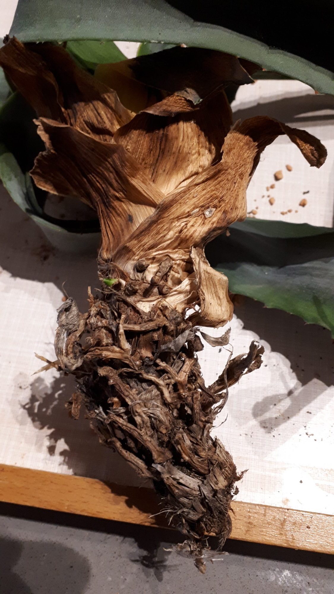 Die Mutterpflanze ist mir aber entgegengefallen, denn der Stamm war so porös, dass er einfach vom Unterteil 'weggefallen' ist. Weiß nicht, wie ich das anders beschreiben soll. Ich hab sie nur oben angefasst ohne fest zu ziehen und hatte das obere Teil in der Hand. Das untere Teil im Substrat war innen total hohl und mir krabbelte eine Assel entgegen, die dort wohl ihr zuhause hatte.