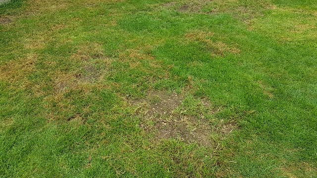 im Rasen eingenistet hat. Das ist an den abgestorbenen Pflanzen zu sehen.