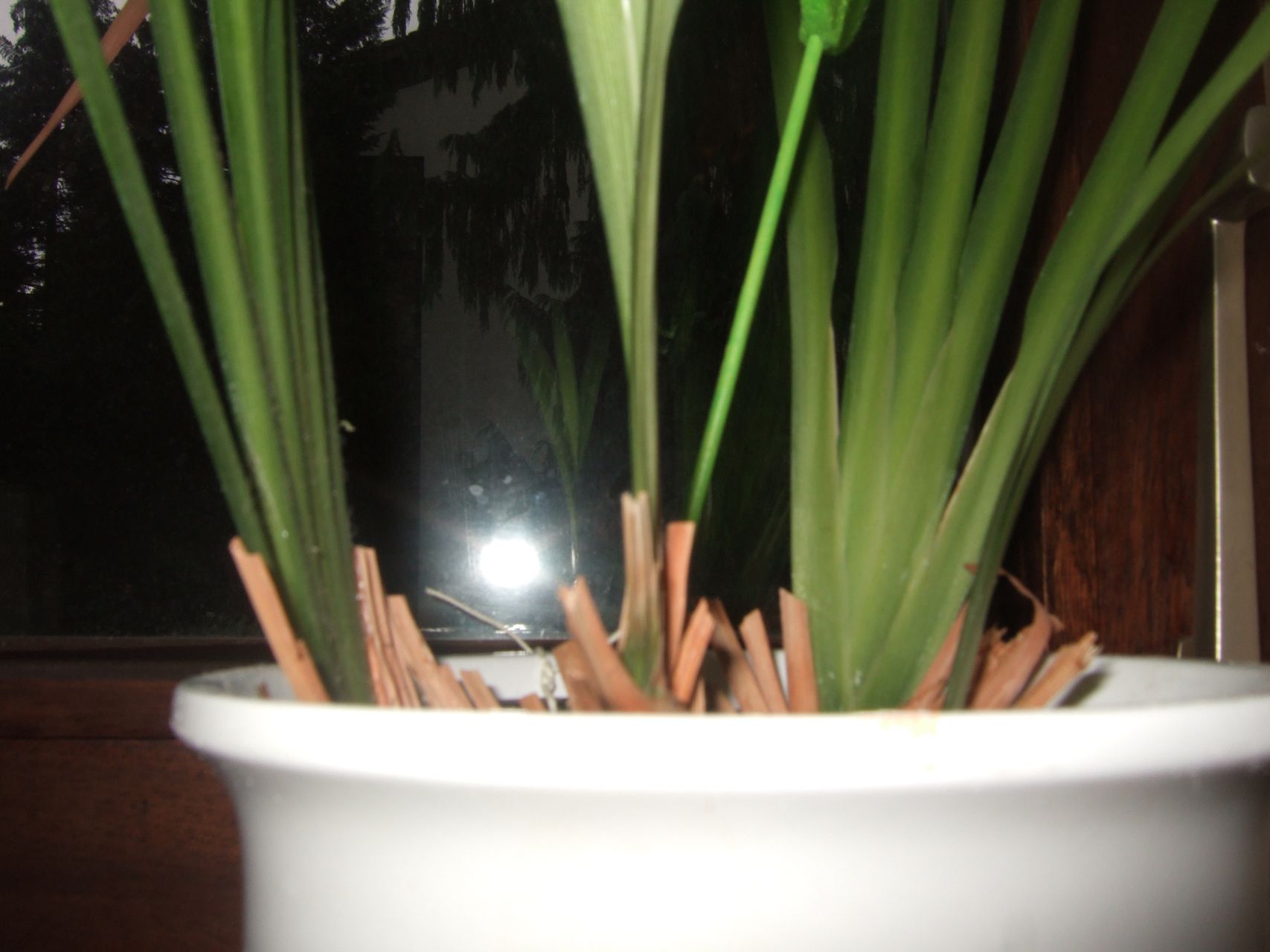 Sie hatte noch nie (in 10 Jahren) BLüten. die Blätter sind fingerbreit und ca 30 bis 60 cm lang.