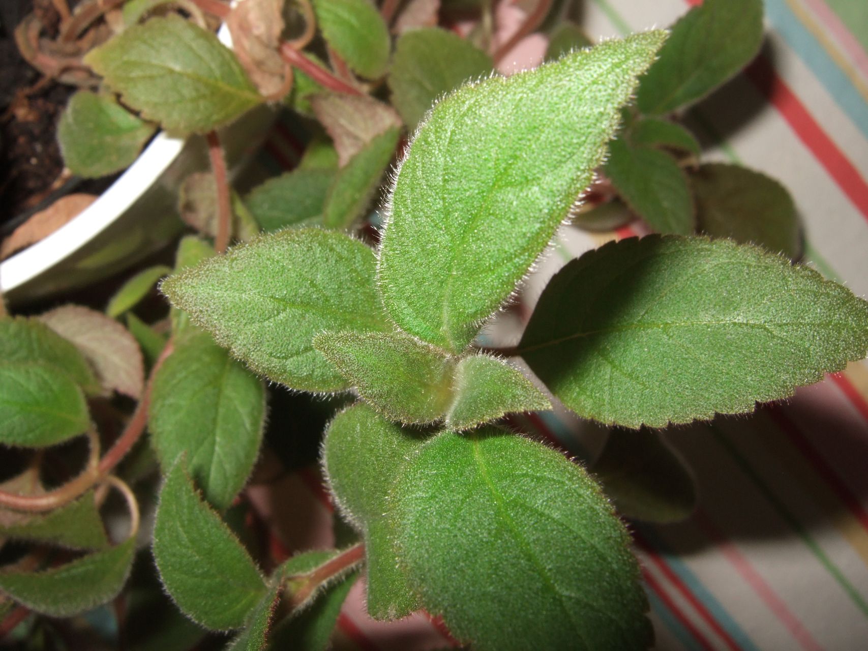 jemand meinte es wäre eine "bulgarische Blume" - den Namen konnte ich aber nirgends finden. Viele meinte es wäre eine Art Nessel. ganz selten (alle 2-3 Jahre macht sie 1 oder 2 rote haarige Blüten, die wie Fingerhut aussehen. Die Blätter sind sehr pelzig; von unten betrachtet sind die Blatt"rillen" rötlich. Die Blätter und Stengel brechen sehr leicht ab. Manchmal macht sie komische „raupenähnliche Würste“ direkt da wo sie aus der Erde kommt (sorry, keine Ahnung was das ist).