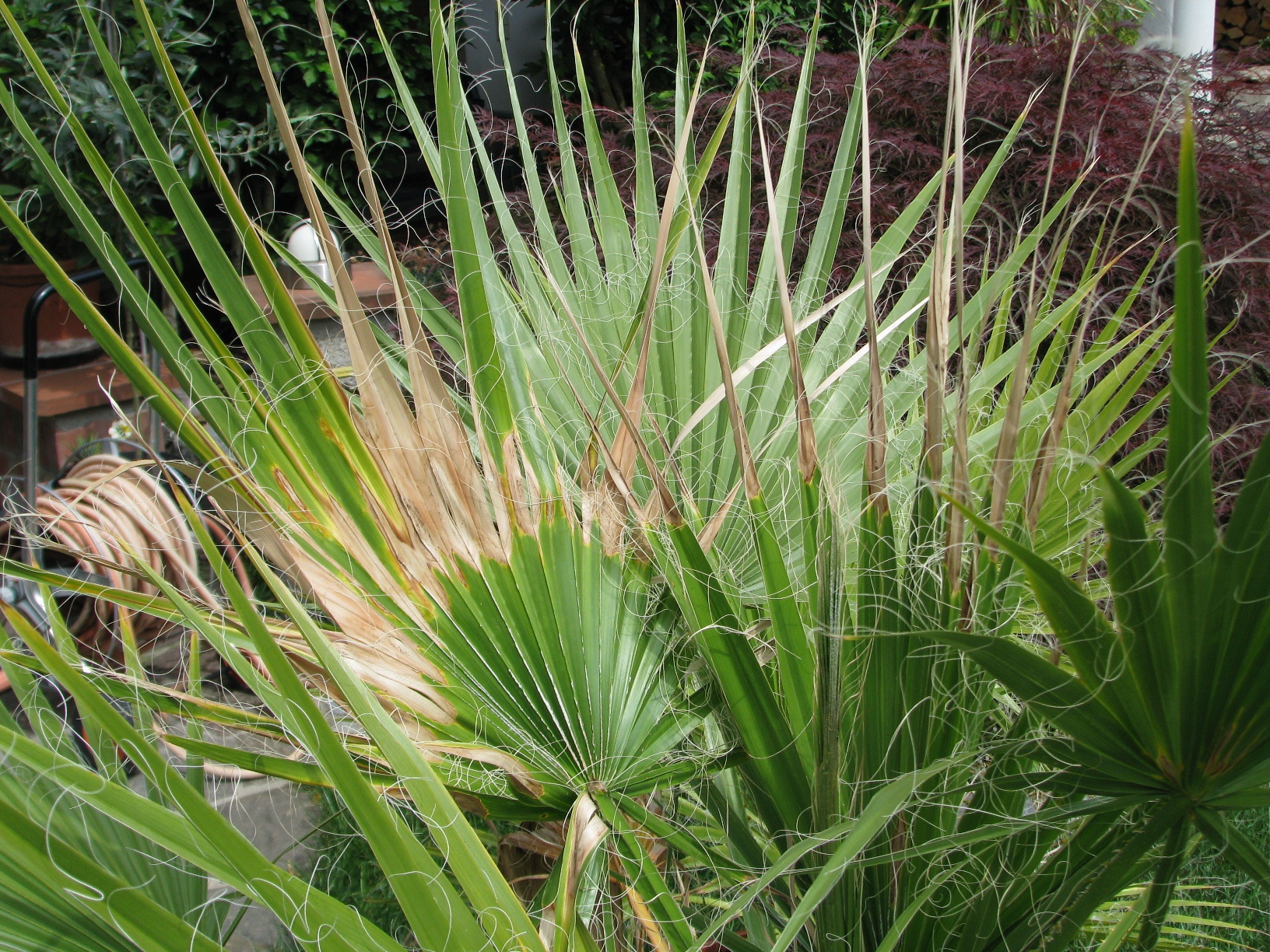meine immer wunderschöne Washingtonia hat über den Winter braune Blattbereiche bekommen. Zunächst dachte ich es seien Winterränder, aber nun geht das weiter und meine Palme (und ich) hoffen, daß ihr Rat wißt. Auf Bild 1 sieht kann man dem Gesamtzustand der Pflanze sehen.