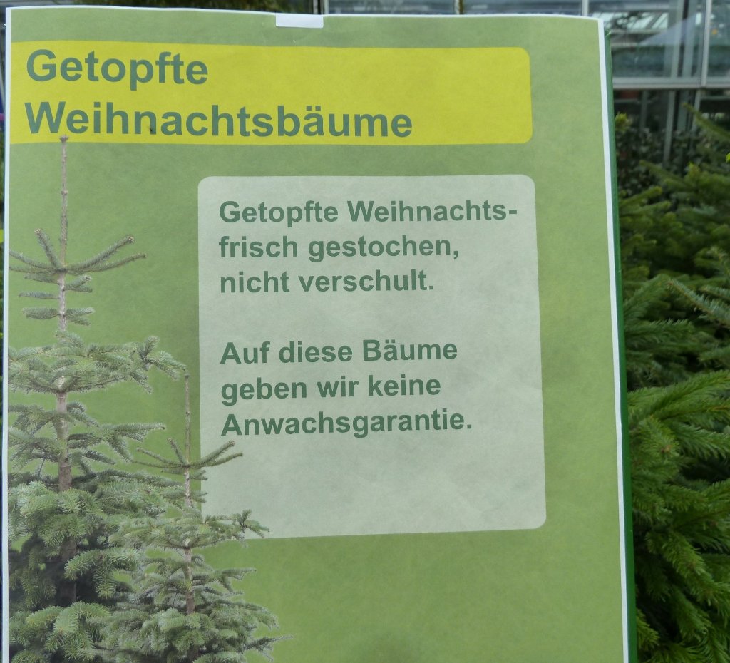 Warum ich das schreibe: fragt mal in einem Markt der Weihnachtsbäume im Topf anbietet, ob das gestochene, ballierte oder Topfballenpflanzen sind. Und wenn sie behaupten es seien Ballenpflanzen, dann seid so mutig und zieht mal einen aus dem Topf raus. Wenns krümelt habt ihr eine falsche Auskunft bekommen (und könnt mit Hinweis auf diese Falschaussage das Kehren verweigern).