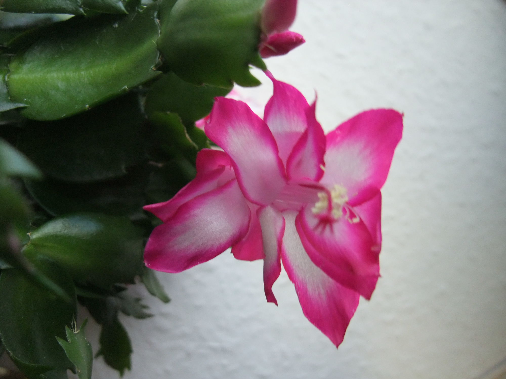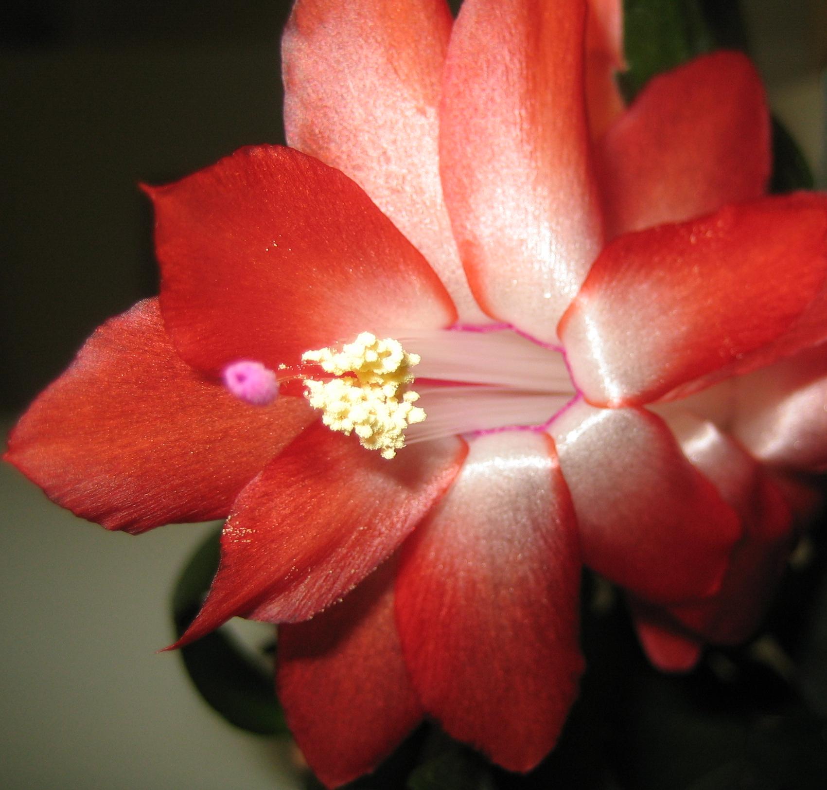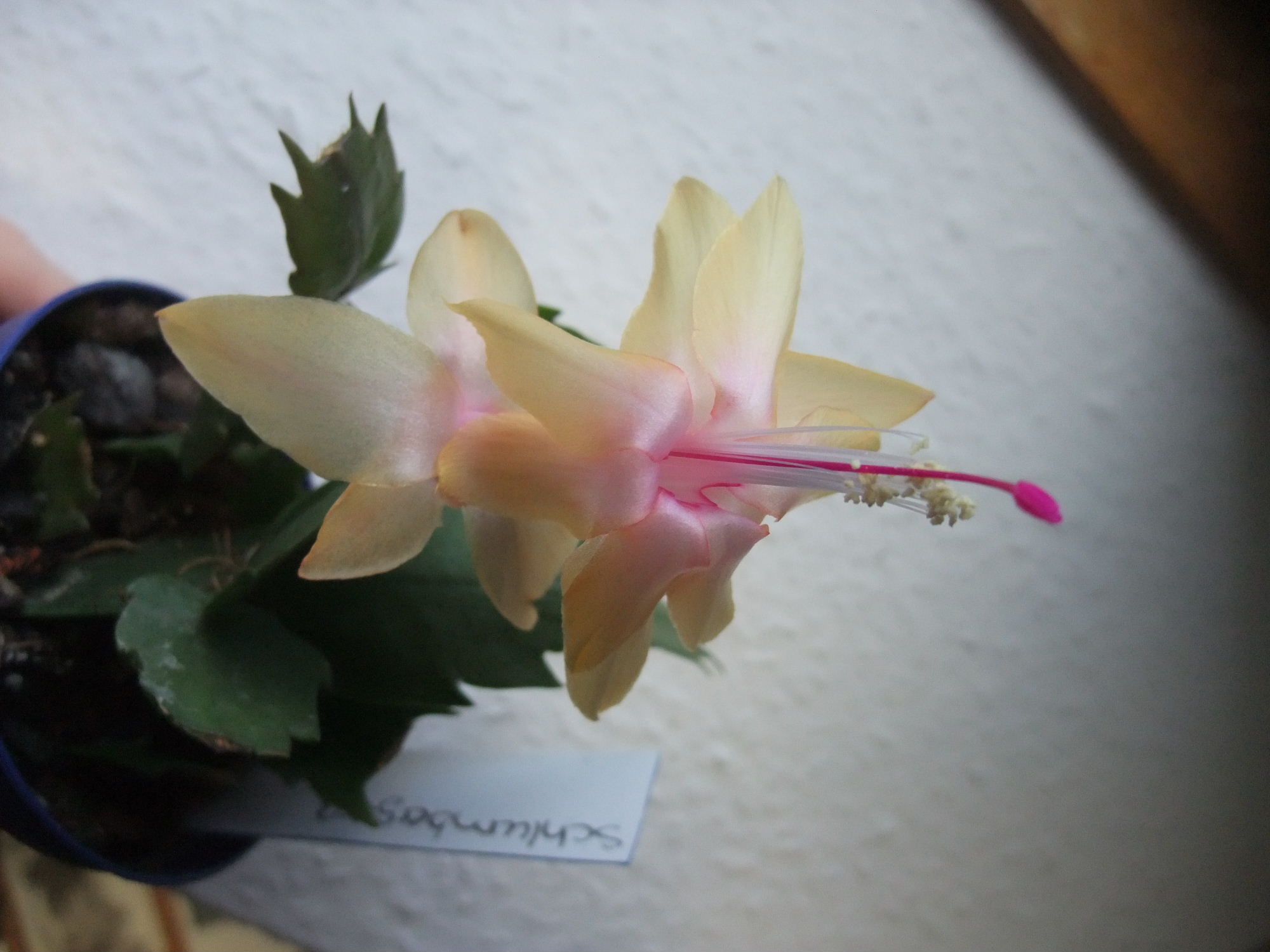 Über Weihnachten war ich bei meinen Eltern, da blühte gerade ein Schlumbi, den ich dort mal "gerettet", d.h. neu getopft und bisschen gepäppelt hatte. Die Farbe war eine Art dunkles Magenta, so ähnlich wie der von Wollschweber gezeigte (hab ihn nicht fotografiert, weil man die Farbe so gut wie nie originalgetreu aufs Bild kriegt). Obwohl ich ja EIGENTLICH keinen Platz mehr habe, hab ich mir ein paar Steckis mitgenommen. Bin mal gespannt, ob er diese Farbe behält, oder ob es eigentlich ein Roter ist, dem es ziemlich kalt war, bei meinen Eltern steht er nämlich im ungeheizten Gästebad