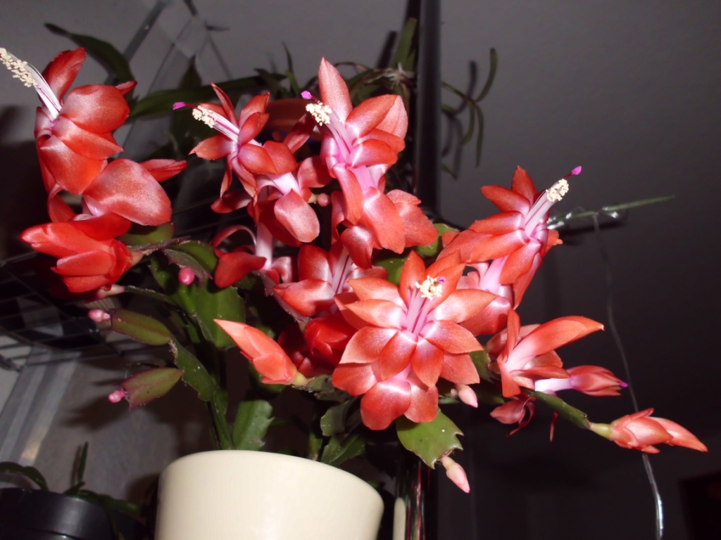So, heute hab ich dumm geschaut. Das mit den Farben mal heller mal dunkler, das habe ich ja inzwischen verstanden. Was ich so absolut nicht verstanden habe, ist das was da grad im Kinderzimmer passiert. Ihr wißt ja zum Teil, daß ich vor zwei Jahren etwa meine große Schale mit meinen geliebten roten und weißen Weihnachtskakteen dank Blödheit gehimmelt habe. Nun ja, zwei Stecklinge haben überlebt und ich habe sie mitsamt dem Weihnachtsengelstecker der auch schon in der Schale war, in einen kleinen Topf gesetzt. Soweit so gut, dieses Jahr kamen Blüten und die erste war heute offen.Toll, es stand zu Wahl rot oder weiß, wer wettet hat 50% Chancen zu gewinnen. Denkste, schaut Euch DAS an: