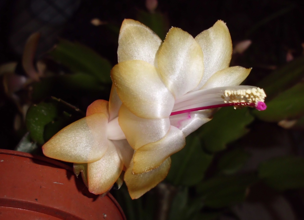 So, heute hab ich dumm geschaut. Das mit den Farben mal heller mal dunkler, das habe ich ja inzwischen verstanden. Was ich so absolut nicht verstanden habe, ist das was da grad im Kinderzimmer passiert. Ihr wißt ja zum Teil, daß ich vor zwei Jahren etwa meine große Schale mit meinen geliebten roten und weißen Weihnachtskakteen dank Blödheit gehimmelt habe. Nun ja, zwei Stecklinge haben überlebt und ich habe sie mitsamt dem Weihnachtsengelstecker der auch schon in der Schale war, in einen kleinen Topf gesetzt. Soweit so gut, dieses Jahr kamen Blüten und die erste war heute offen.Toll, es stand zu Wahl rot oder weiß, wer wettet hat 50% Chancen zu gewinnen. Denkste, schaut Euch DAS an: