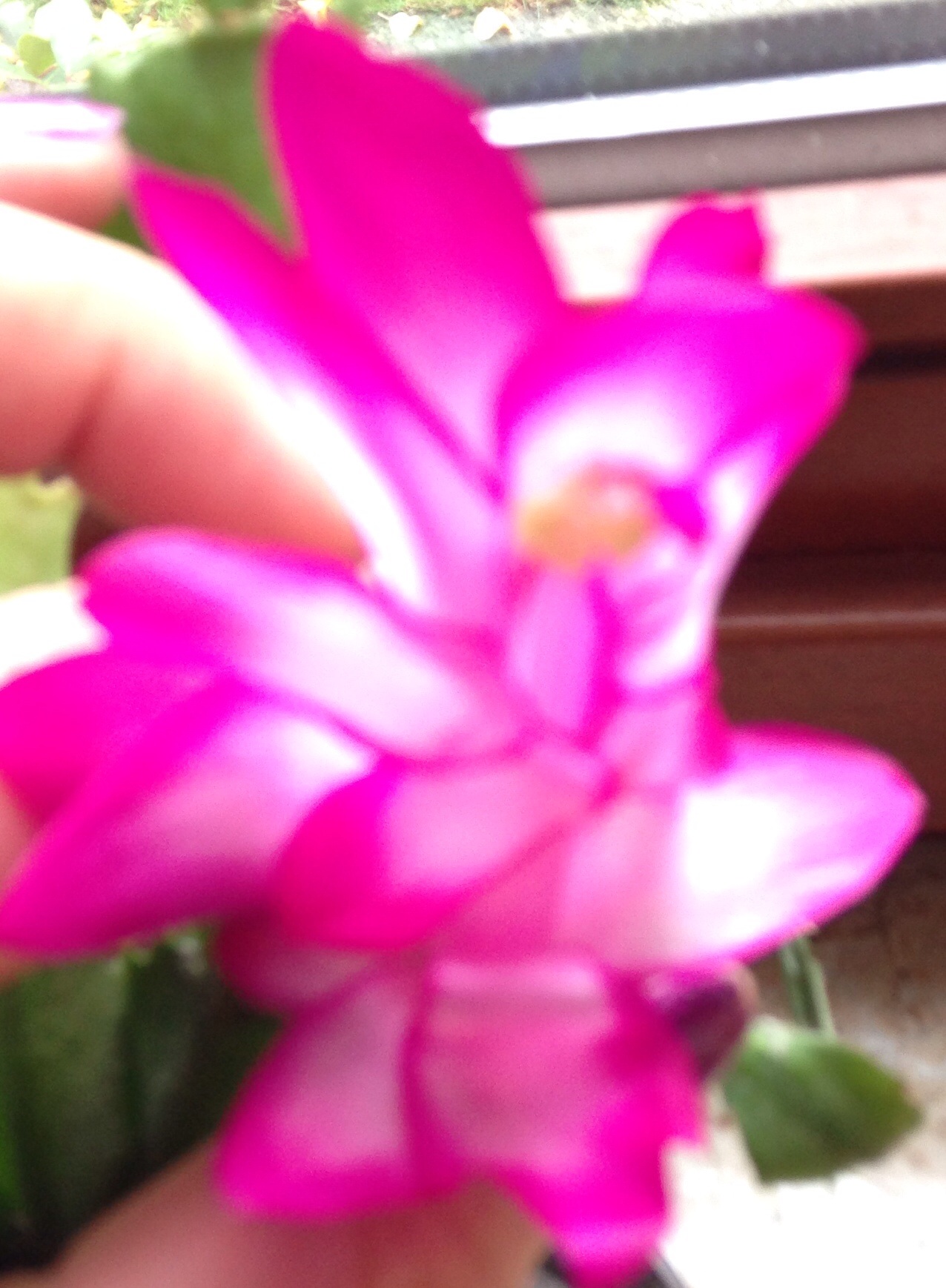 So, heute hab ich dumm geschaut. Das mit den Farben mal heller mal dunkler, das habe ich ja inzwischen verstanden. Was ich so absolut nicht verstanden habe, ist das was da grad im Kinderzimmer passiert. Ihr wißt ja zum Teil, daß ich vor zwei Jahren etwa meine große Schale mit meinen geliebten roten und weißen Weihnachtskakteen dank Blödheit gehimmelt habe. Nun ja, zwei Stecklinge haben überlebt und ich habe sie mitsamt dem Weihnachtsengelstecker der auch schon in der Schale war, in einen kleinen Topf gesetzt. Soweit so gut, dieses Jahr kamen Blüten und die erste war heute offen.Toll, es stand zu Wahl rot oder weiß, wer wettet hat 50% Chancen zu gewinnen. Denkste, schaut Euch DAS an:
