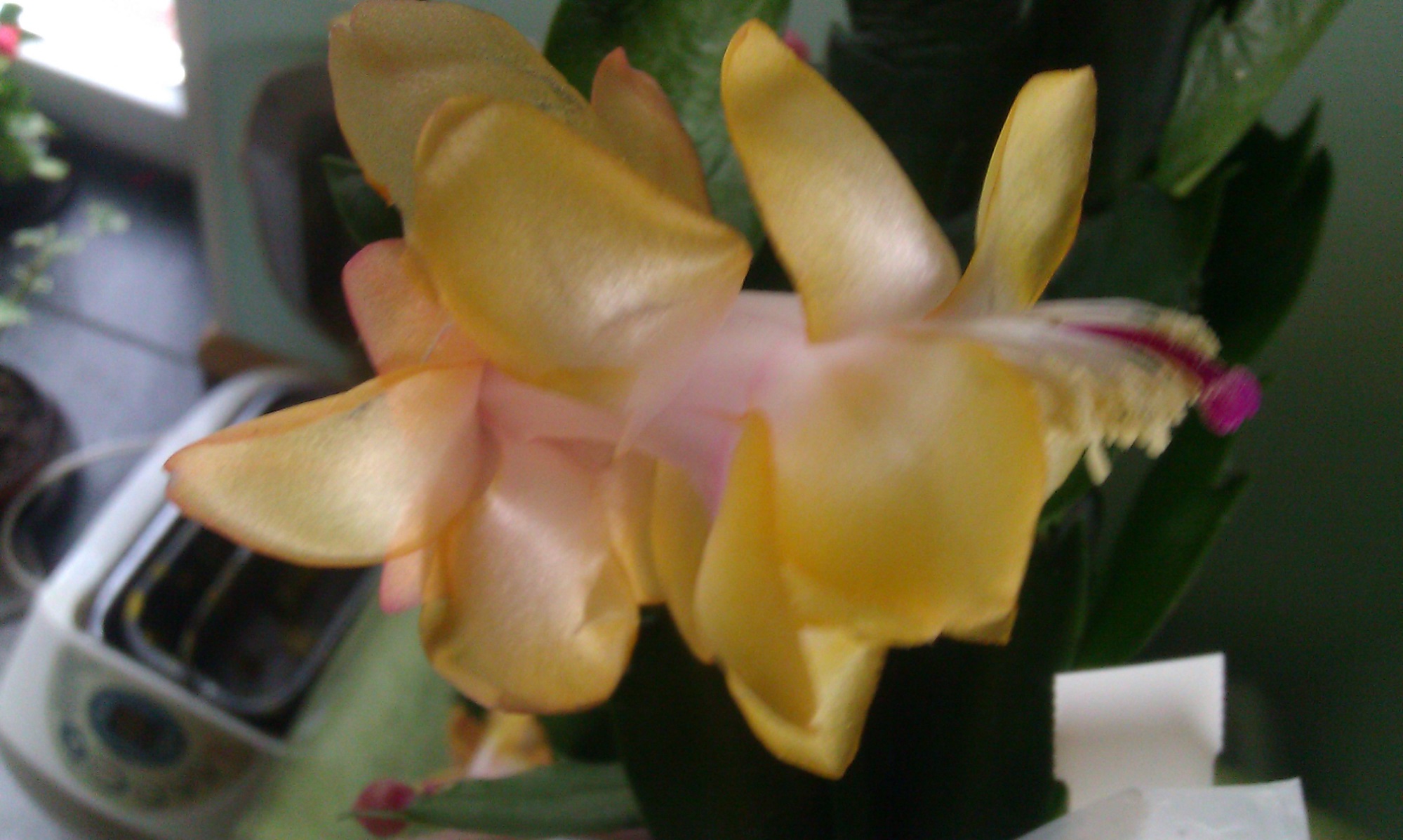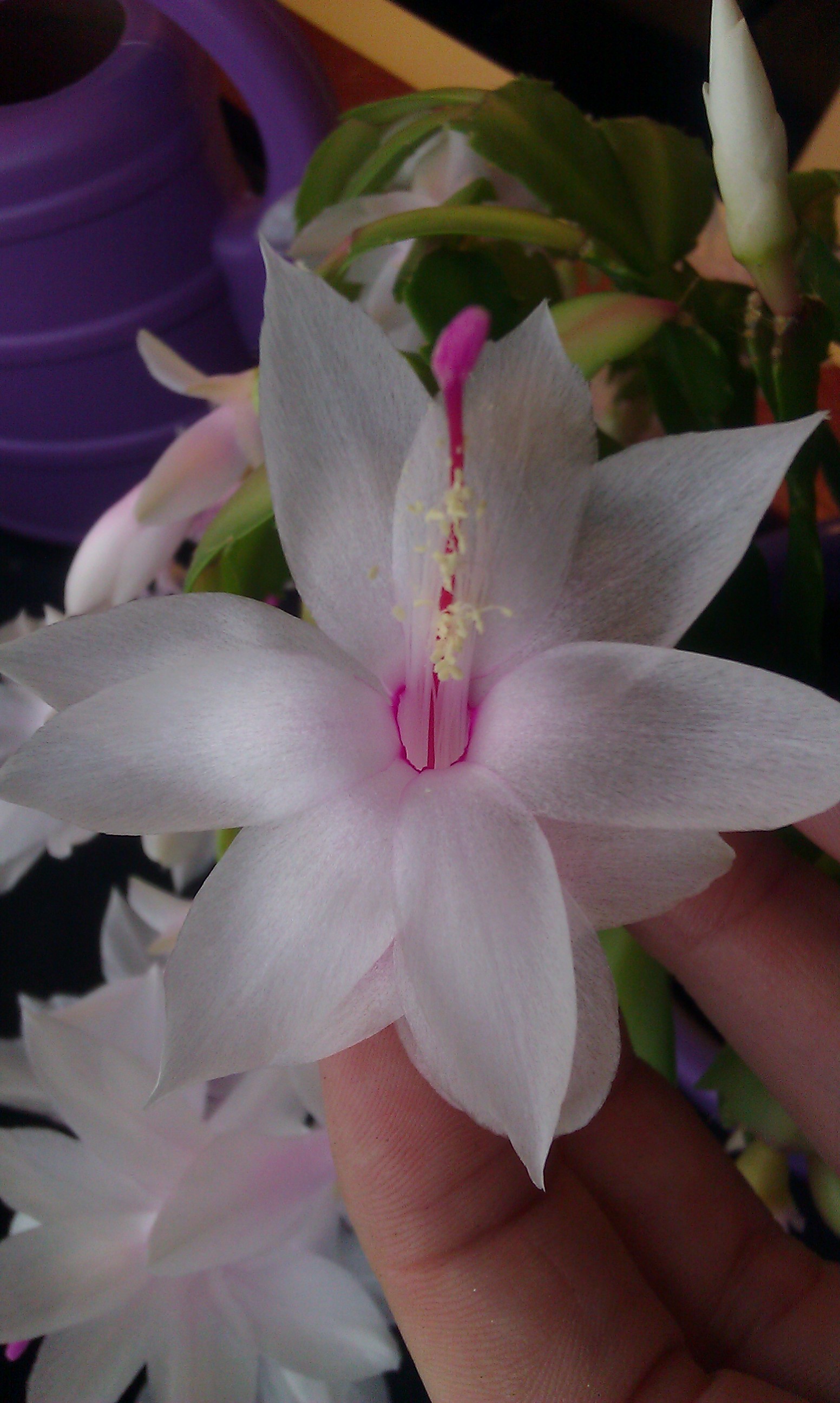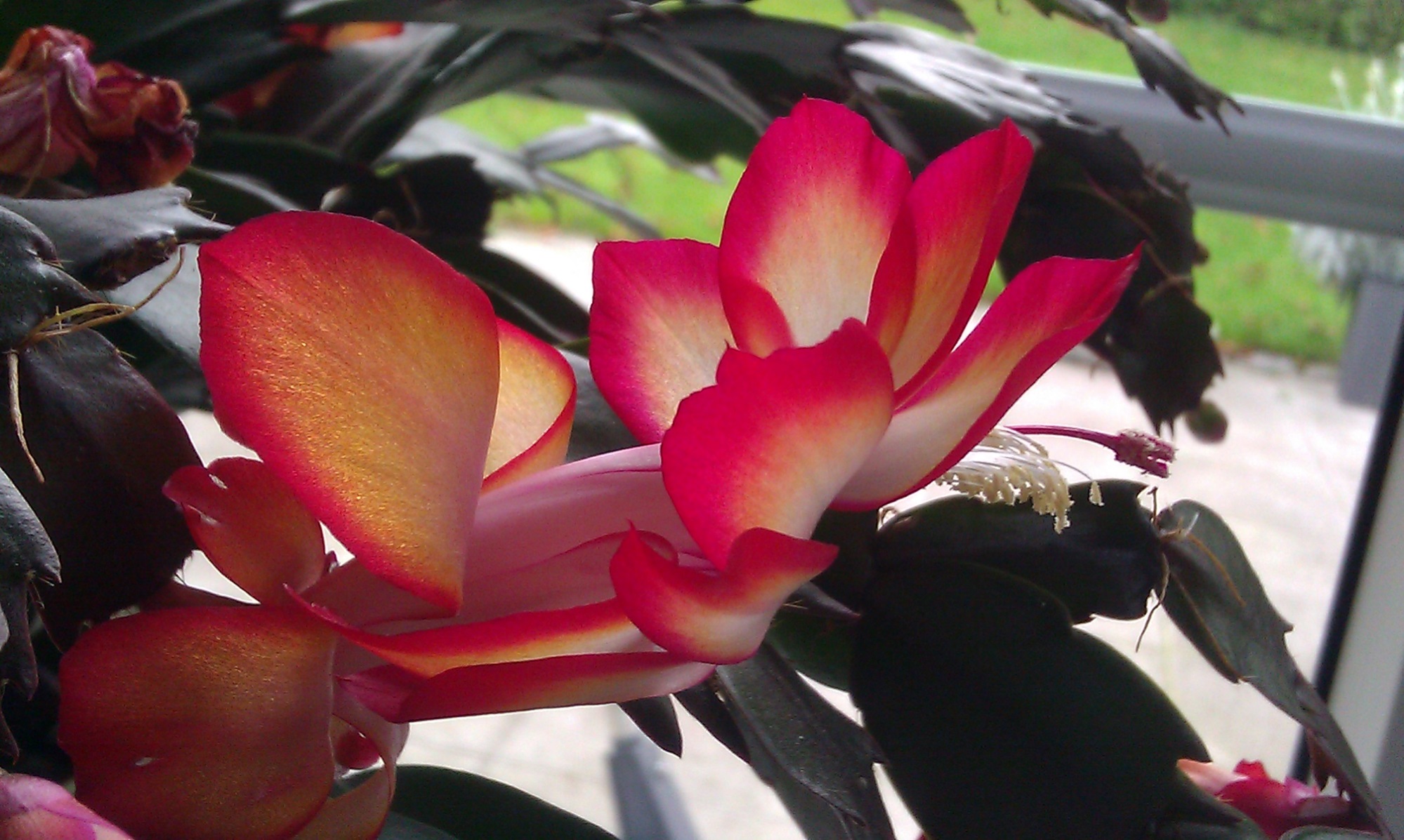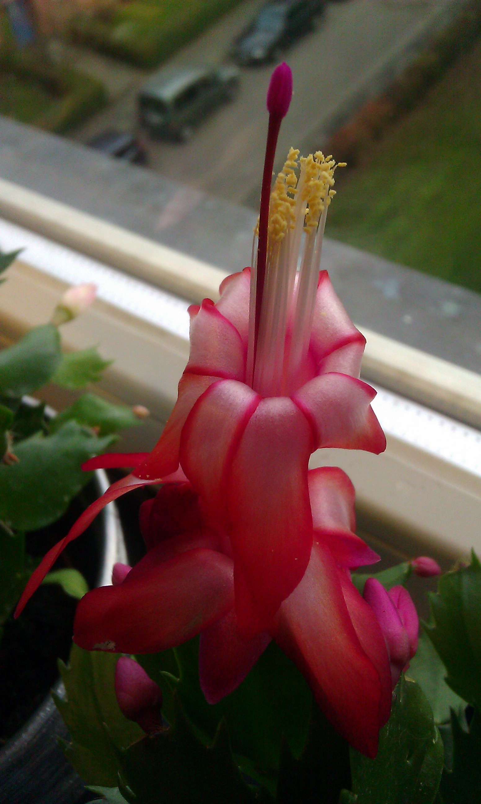 Komm ich vorhin nach Hause und muss feststellen, dass meine Jalousie runtergeknallt ist - und wohin? Klar - in die Schlumbischale Leider sind einige (reichlich) Knospen dabei abgefallen , aber ein paar sind auch noch dran