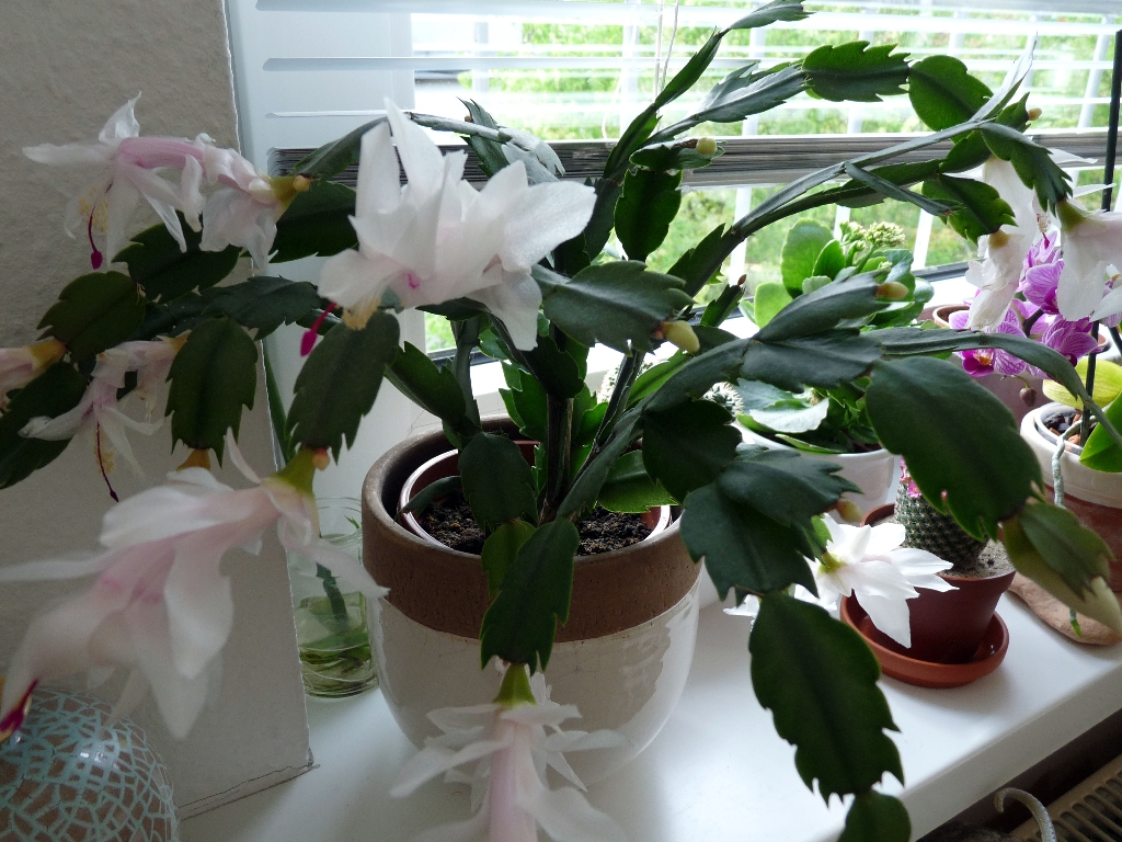 Sie mussten diesen Winter (wegen akutem Platzmangel im Haus) in der Garage verbringen, war ihnen aber überhaupt nichts ausgemacht hat. Als wir dann Ende März für zwei Wochen verreist sind, mussten sie ins Freie. Sonst hätte das Auto nicht in die Garage gepasst. Und während wir in Florida waren und in der warmen Sonne saßen, hat es hier nochmal geschneit. Bei MINUS sechs Grad! Das haben sie leider nicht überlebt, die schönen Weihnachtskakteen.