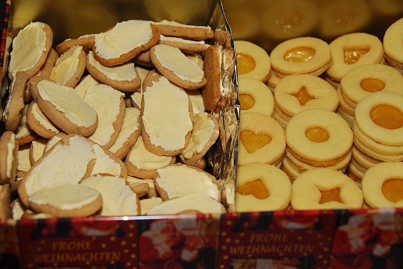 Was wär die Adventzeit ohne den Duft von Weihnachtsbäckerei im Haus? Genau, öde und stimmungslos wär's. Ich hab daher Anfang der Woche zu backen begonnen. Bisher sind fertig: Vanillekipferl, Husarenkrapferl, Linzer Sternderl, Butterbrote, Spitzbuben. Was noch gebacken werden muß: Anisbögen und mit Schokoglasur verzierte und Marmelade gefüllte Kekse.