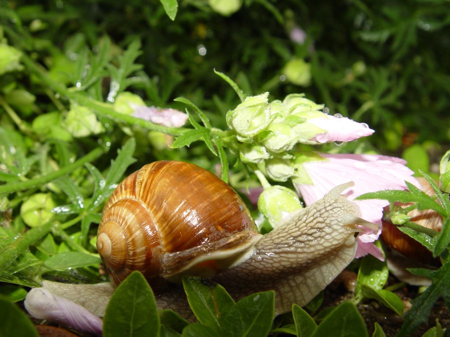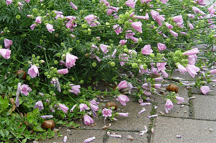 als ich gestern abend nach Hause kam, habe ich nicht schlecht gestaunt. Nachdem es den Tag über teils sehr heftig geregnet hat, lagen an meinem Malvenstrauch viele Blüten auf dem Boden und auch die Zweige haben der Schwerkraft nachgegeben. Für die Weinbergschnecken von nah und fern muss das wie eine Einladung zum Festessen gewesen sein.