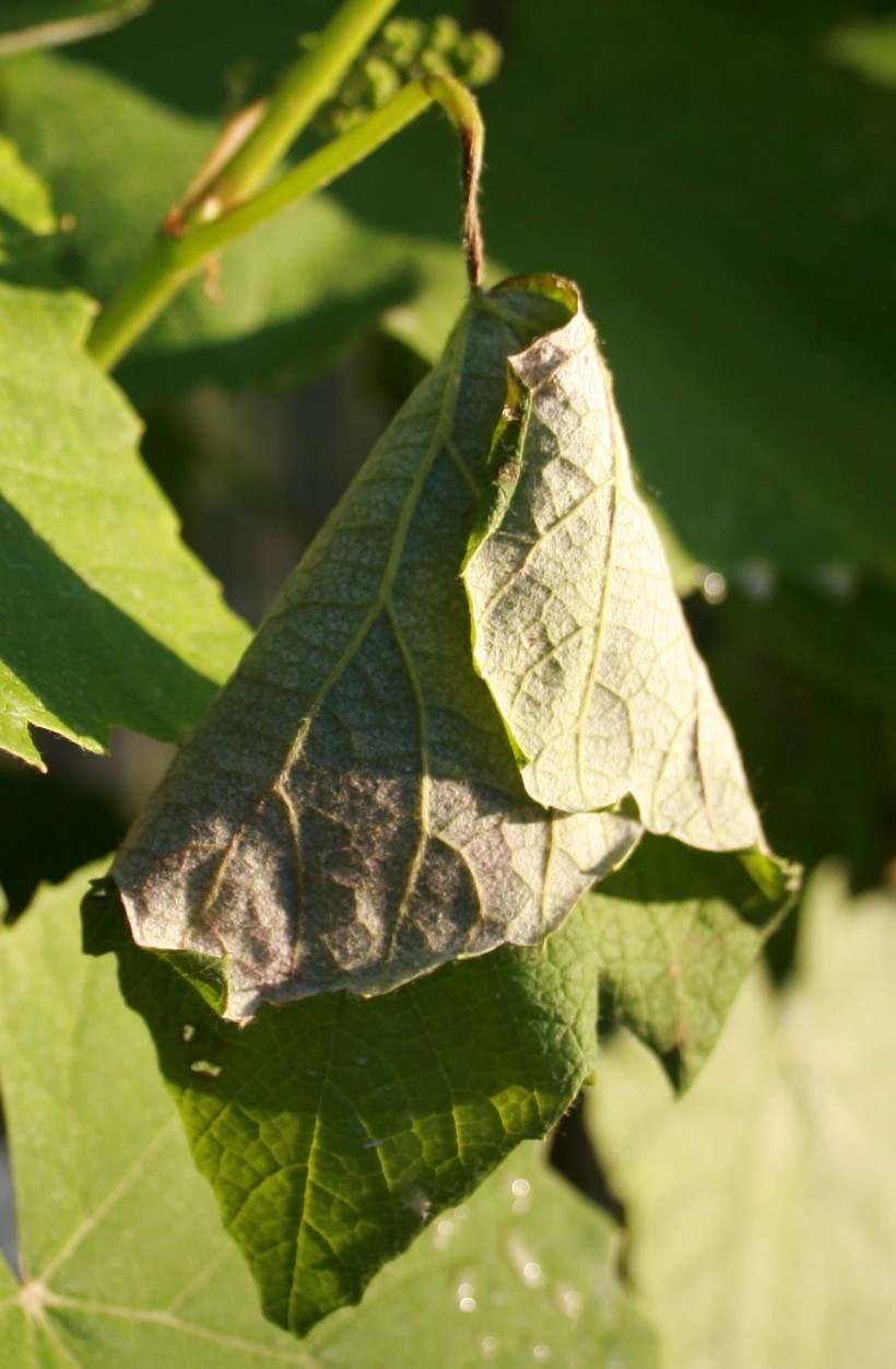 ich habe vier Weinstöcke in Süd-west lage an meiner Terrasse. In diesem Jahr beobachte ich das 1. mal, dass die Weinblätter sich einrollen und trocken werden. Erst habe ich an Windbruch gedacht, da der Blattstiel abknickt. Aber dann rollen sich die Blätter wie eine Zigarre auf.