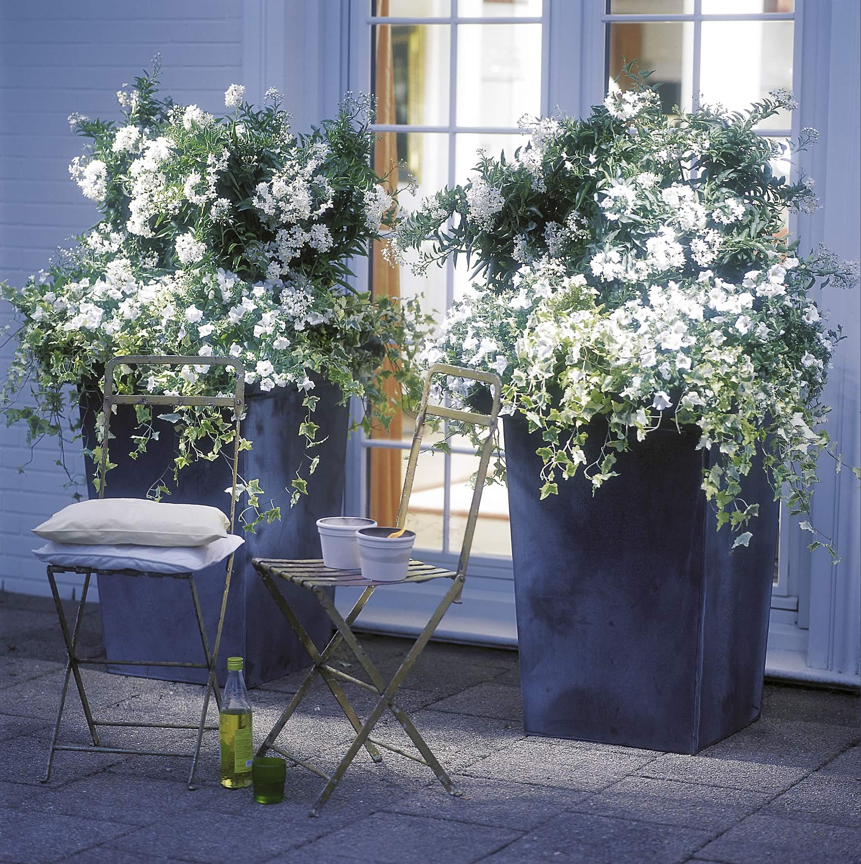 Apropos: Für den lauen Sommerabend auf dem Balkon sind weiße Blüher eh am besten. Während kräftige Farben in der Dämmerung untergehen, treten helle Blüten und Blätter deutlich hervor und bringen die Kübel und Kästen erst richtig zum Leuchten.