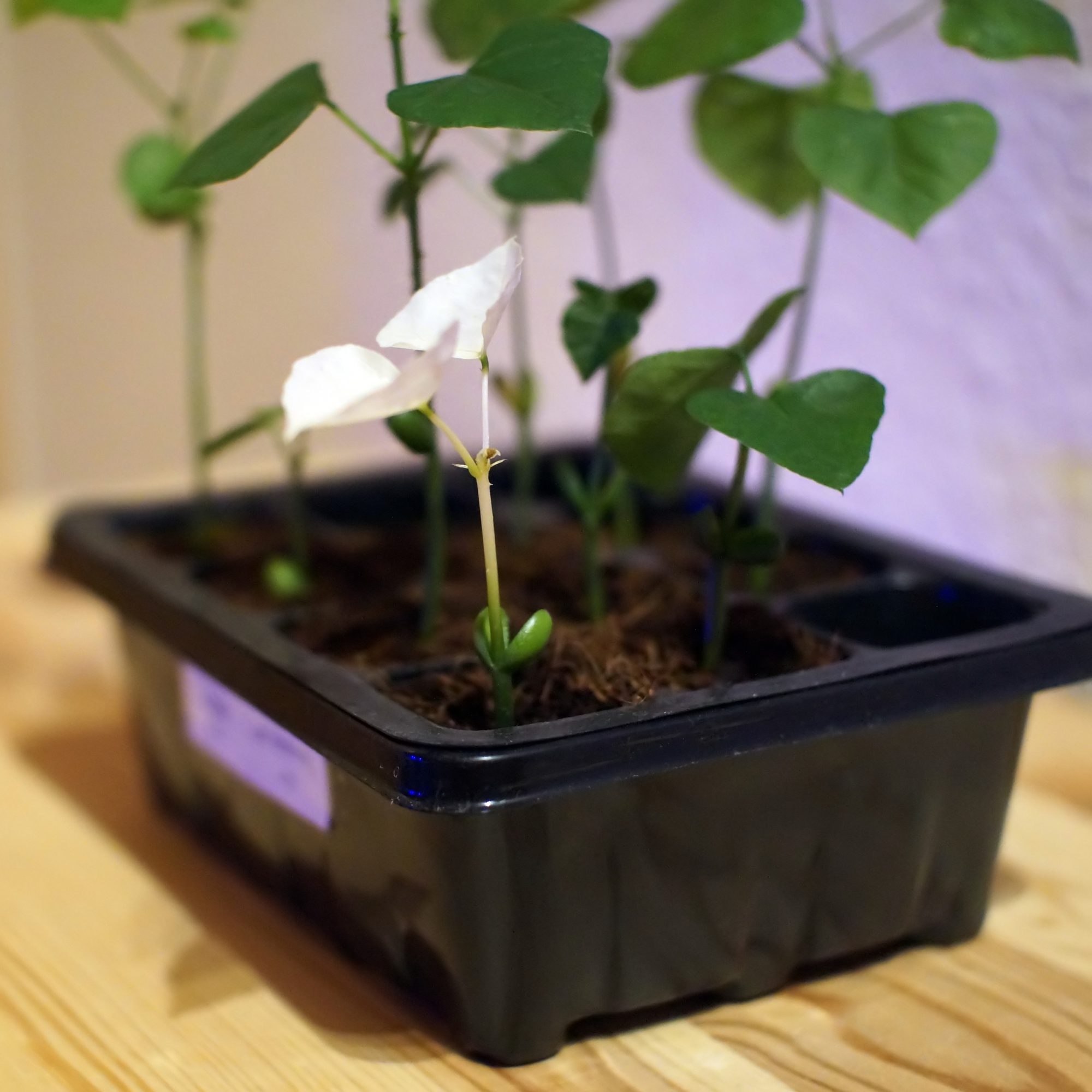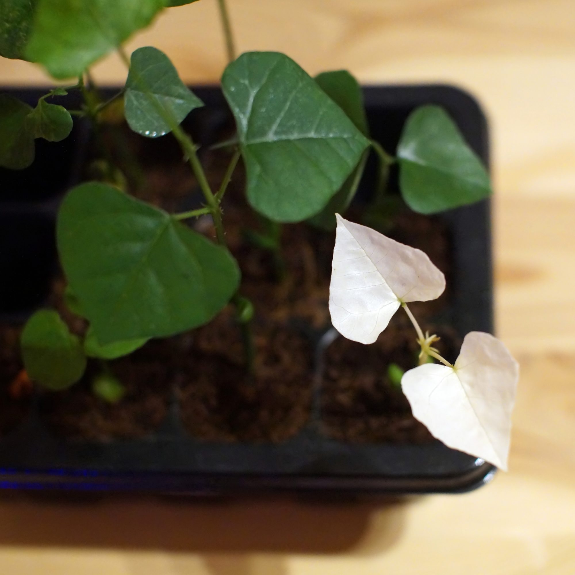 Bei diesen Keimlingen gibt's nun jeweils ein Exemplar mit weißen Blättern - richtig albinoweiß, kein Belag oder Befall - während alle anderen Artgenossen völlig normal wachsen. Alle werden absolut gleich behandelt, stehen in Kokoserde unter einem Dachfenster mit zusätzlicher Pflanzenlampe und werden nach Bedarf bewässert.