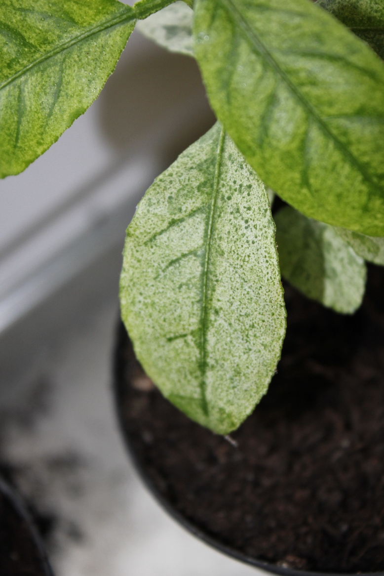 die Blätter sind eher weiss. Ich hatte erst gedecht es wäre vielleicht nur Staub/Dreck, aber es lässt sich auch nicht abwaschen. Das Pflänzchen steht bei uns im Wohnzimmer bei 20-22°C an einem Südfenster und wird einmal in der Woche mit abgestandenen Mineralwasser gegossen.