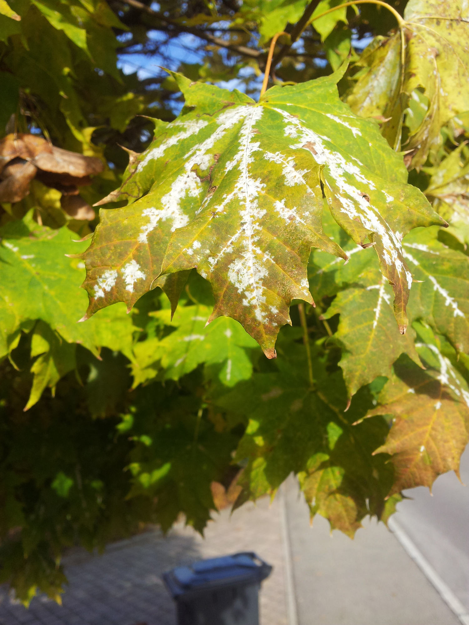 mein Kugelahorn hat weiße Flecken auf den Blättern (siehe Bild). Das hat er immer wieder gegen Ende des Sommers.
