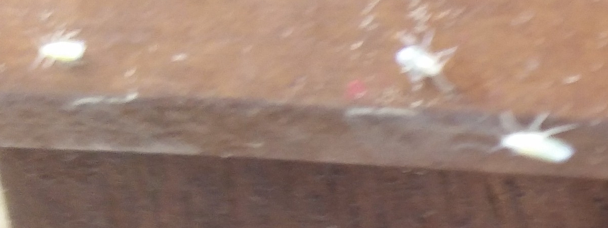 Das sind meiner Meinung nach (leider ist die Bildmontage auch recht unscharf) grüne Blattläuse. Die geflügelten Weibchen sind auf der Suche nach neuen Pflanzen zum Besiedeln, daher trifft man die auch gerne mal woanders an, wenn das alte Zuhause zu eng wird.