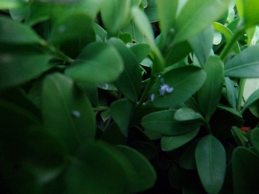 Ich bin grad am Buchsschneiden und stelle fest: überall weiße Stellen und weiße Fliegen.