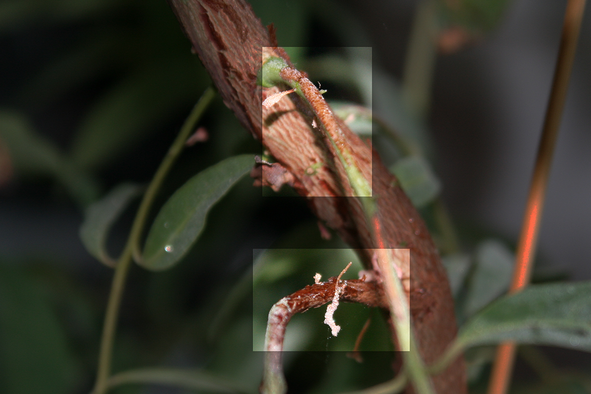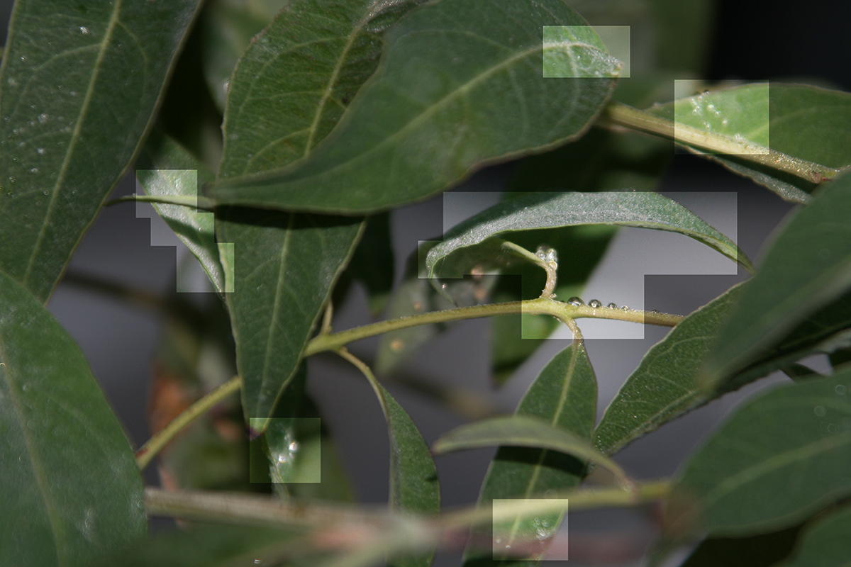 Diese halten sich an der Blattunterseite auf, legen dort auch weiße Eier und hinterlassen klebriges Irgendwas auf den Blättern und an den unteren Ästen.