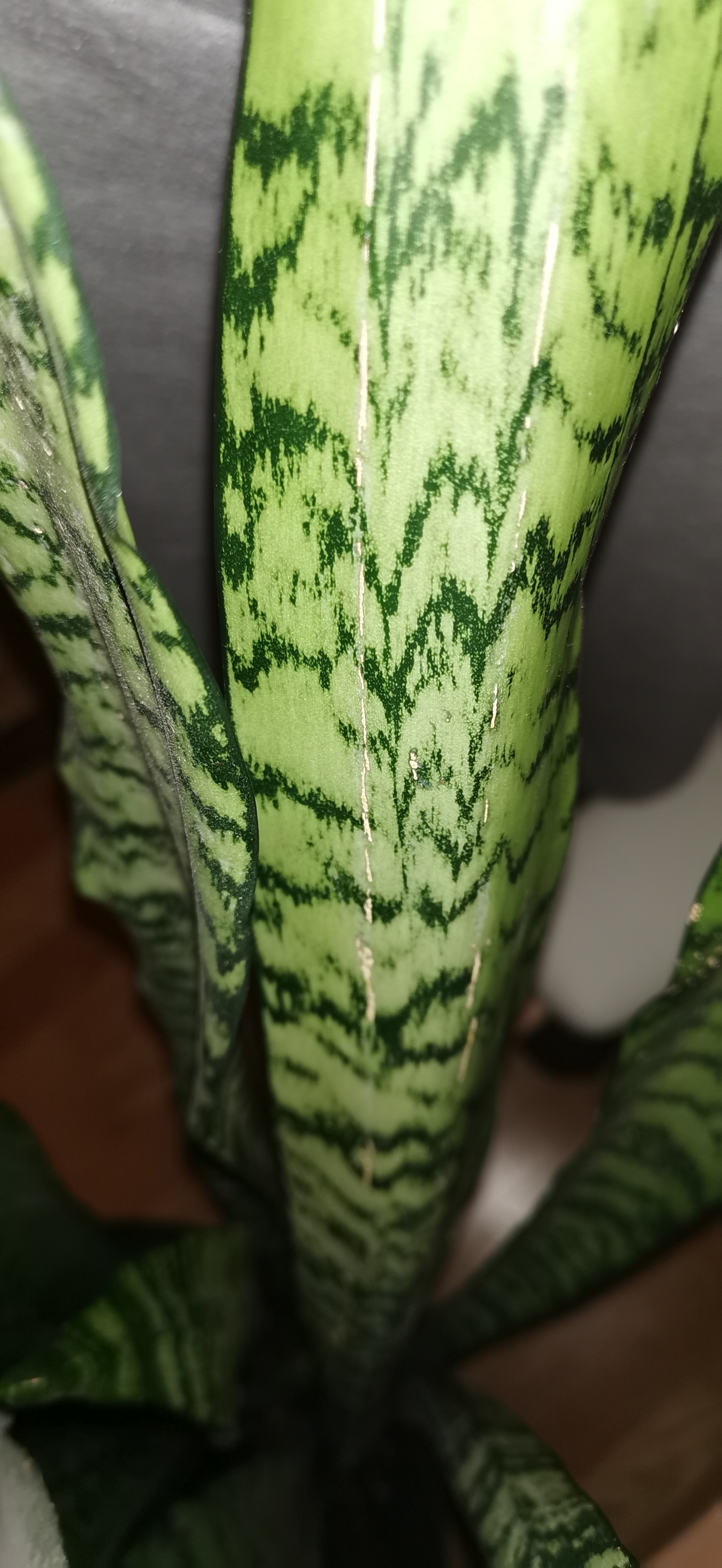 Manchmal sehe ich auch kleine Verdickungen, die noch grün sind. Auf Blattrückseiten sind teilweise sehr lange weiße Linien zu finden, siehe Bilder. Die Pflanze ist sehr groß und dicht. Bei den Linien könnte ich mir kleine Brüche in dicken Blättern vorstellen, wo Saft austritt, aber die Knubbel passen dazu nicht. Wenn ich die weißen Flecken abkratze, ist die Unterseite leicht rötlich. Das passt auch nicht so wirklich zu Pflanzensaft, oder?