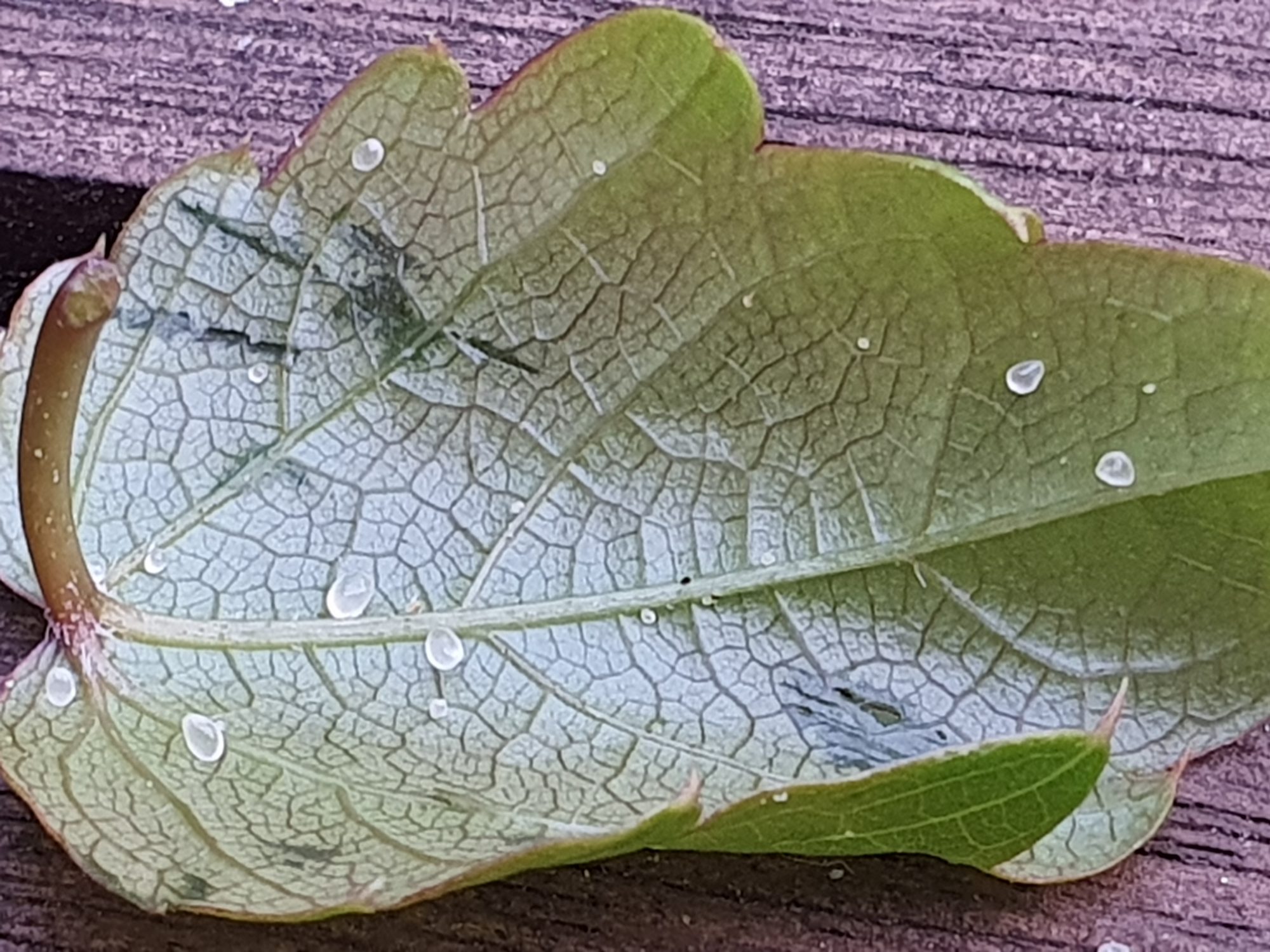 Auf einem Teil meines Veitschi der vor Regen geschützt ist finden sich in den letzten Tagen kleine, weiße bzw durchsichtige Kügelchen an den Blattunterseiten und Stielen der Blätter.
